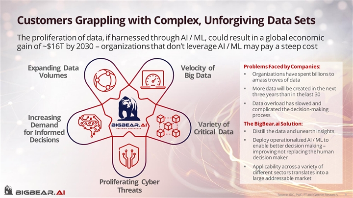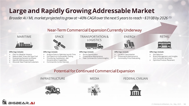 Customers Grappling with Complex, Unforgiving Data Sets The proliferation of data, if harnessed through AI / ML, could result in a global economic gain of ~$16T by 2030 – organizations that don’t leverage AI / ML may pay a steep cost Problems Faced by Companies: ▪ Organizations have spent billions to amass troves of data ▪ More data will be created in the next three years than in the last 30 ▪ Data overload has slowed and complicated the decision-making process The BigBear.ai Solution: ▪ Distill the data and unearth insights ▪ Deploy operationalized AI / ML to enable better decision making – improving not replacing the human decision maker ▪ Applicability across a variety of different sectors translates into a large addressable market Source: IDC, PwC, FT and Gartner Research. 9Customers Grappling with Complex, Unforgiving Data Sets The proliferation of data, if harnessed through AI / ML, could result in a global economic gain of ~$16T by 2030 – organizations that don’t leverage AI / ML may pay a steep cost Problems Faced by Companies: ▪ Organizations have spent billions to amass troves of data ▪ More data will be created in the next three years than in the last 30 ▪ Data overload has slowed and complicated the decision-making process The BigBear.ai Solution: ▪ Distill the data and unearth insights ▪ Deploy operationalized AI / ML to enable better decision making – improving not replacing the human decision maker ▪ Applicability across a variety of different sectors translates into a large addressable market Source: IDC, PwC, FT and Gartner Research. 9