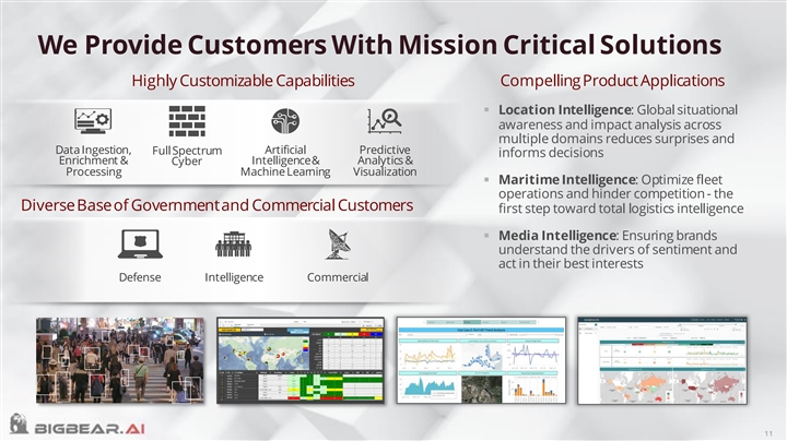 Large and Rapidly Growing Addressable Market (1) Broader AI / ML market projected to grow at ~40% CAGR over the next 5 years to reach ~$310B by 2026 Near-Term Commercial Expansion Currently Underway MARITIME SPACE TRANSPORTATION & ENERGY RETAIL LOGISTICS Offerings include: Offerings include: Offerings include: Offerings include: Offerings include: ➢ Plan for Weather Impacts➢ Analyze Data to Optimize Launch Time➢ Route Optimization➢ Location Optimization➢ Site Selection ➢ Reduce Wait Times and Save Fuel➢ Full-Spectrum Vulnerability Testing➢ Preventative Maintenance➢ Preventative Maintenance➢ Brand Management and Insights ➢ Forecasting Demand and Rates➢ Processing, Exploitation, and ➢ Fleet Command & Control Insights➢ Commodity Price Forecasting into Customer Sentiment ➢ Identify Maintenance Needs Dissemination Capabilities➢ Optimize Product Placement ➢ Discover New Potential Customers➢ Command & Control Services Potential for Continued Commercial Expansion INFRASTRUCTURE MEDIA FEDERAL CIVILIAN (1) MarketsAndMarkets, Inc., May, 2021. 10Large and Rapidly Growing Addressable Market (1) Broader AI / ML market projected to grow at ~40% CAGR over the next 5 years to reach ~$310B by 2026 Near-Term Commercial Expansion Currently Underway MARITIME SPACE TRANSPORTATION & ENERGY RETAIL LOGISTICS Offerings include: Offerings include: Offerings include: Offerings include: Offerings include: ➢ Plan for Weather Impacts➢ Analyze Data to Optimize Launch Time➢ Route Optimization➢ Location Optimization➢ Site Selection ➢ Reduce Wait Times and Save Fuel➢ Full-Spectrum Vulnerability Testing➢ Preventative Maintenance➢ Preventative Maintenance➢ Brand Management and Insights ➢ Forecasting Demand and Rates➢ Processing, Exploitation, and ➢ Fleet Command & Control Insights➢ Commodity Price Forecasting into Customer Sentiment ➢ Identify Maintenance Needs Dissemination Capabilities➢ Optimize Product Placement ➢ Discover New Potential Customers➢ Command & Control Services Potential for Continued Commercial Expansion INFRASTRUCTURE MEDIA FEDERAL CIVILIAN (1) MarketsAndMarkets, Inc., May, 2021. 10