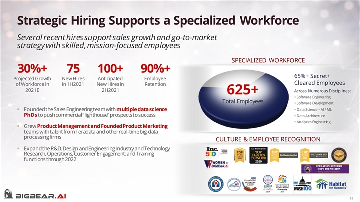 Strategic Hiring Supports a Specialized Workforce Several recent hires support sales growth and go-to-market strategy with skilled, mission-focused employees SPECIALIZED WORKFORCE 30%+ 75 100+ 90%+ 65%+ Secret+ Projected Growth New Hires Anticipated Employee Cleared Employees of Workforce in in 1H2021 New Hires in Retention 2021E 2H2021 Across Numerous Disciplines: 625+ ▪ Software Engineering Total Employees ▪ Software Development ▪ Founded the Sales Engineering team with multiple data science ▪ Data Science – AI / ML PhDsto push commercial “lighthouse” prospects to success▪ Data Architecture ▪ Analytics Engineering ▪ Grew Product Management and Founded Product Marketing teams with talent from Teradata and other real-time big-data processing firms CULTURE & EMPLOYEE RECOGNITION ▪ Expand the R&D, Design and Engineering Industry and Technology Research, Operations, Customer Engagement, and Training functions through 2022 12Strategic Hiring Supports a Specialized Workforce Several recent hires support sales growth and go-to-market strategy with skilled, mission-focused employees SPECIALIZED WORKFORCE 30%+ 75 100+ 90%+ 65%+ Secret+ Projected Growth New Hires Anticipated Employee Cleared Employees of Workforce in in 1H2021 New Hires in Retention 2021E 2H2021 Across Numerous Disciplines: 625+ ▪ Software Engineering Total Employees ▪ Software Development ▪ Founded the Sales Engineering team with multiple data science ▪ Data Science – AI / ML PhDsto push commercial “lighthouse” prospects to success▪ Data Architecture ▪ Analytics Engineering ▪ Grew Product Management and Founded Product Marketing teams with talent from Teradata and other real-time big-data processing firms CULTURE & EMPLOYEE RECOGNITION ▪ Expand the R&D, Design and Engineering Industry and Technology Research, Operations, Customer Engagement, and Training functions through 2022 12