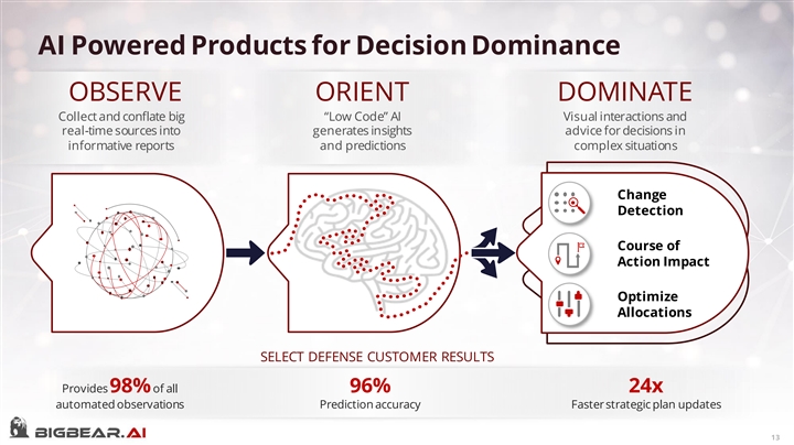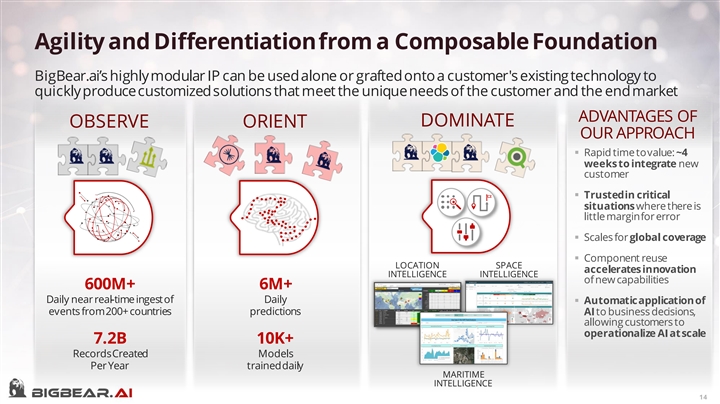AI Powered Products for Decision Dominance OBSERVE ORIENT DOMINATE Collect and conflate big “Low Code” AI Visual interactions and real-time sources into generates insights advice for decisions in informative reports and predictions complex situations Change Detection Course of Action Impact Optimize Allocations SELECT DEFENSE CUSTOMER RESULTS Provides98% of all 96% 24x automated observations Prediction accuracy Faster strategic plan updates 13AI Powered Products for Decision Dominance OBSERVE ORIENT DOMINATE Collect and conflate big “Low Code” AI Visual interactions and real-time sources into generates insights advice for decisions in informative reports and predictions complex situations Change Detection Course of Action Impact Optimize Allocations SELECT DEFENSE CUSTOMER RESULTS Provides98% of all 96% 24x automated observations Prediction accuracy Faster strategic plan updates 13
