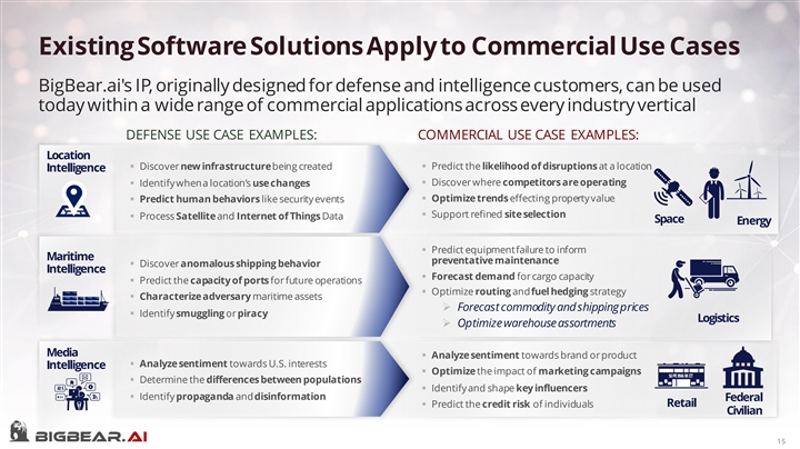 Agility and Differentiation from a Composable Foundation BigBear.ai’s highly modular IP can be used alone or grafted onto a customer's existing technology to quickly produce customized solutions that meet the unique needs of the customer and the end market ADVANTAGES OF DOMINATE OBSERVE ORIENT OUR APPROACH ▪ Rapid time to value: ~4 weeks to integrate new customer ▪ Trusted in critical situationswhere there is little margin for error ▪ Scales for global coverage ▪ Component reuse LOCATION SPACE accelerates innovation INTELLIGENCE INTELLIGENCE of new capabilities 600M+ 6M+ Daily near real-time ingest of Daily ▪ Automatic application of events from 200+ countries predictions AI to business decisions, allowing customers to operationalize AI at scale 7.2B 10K+ Records Created Models Per Year trained daily MARITIME INTELLIGENCE 14Agility and Differentiation from a Composable Foundation BigBear.ai’s highly modular IP can be used alone or grafted onto a customer's existing technology to quickly produce customized solutions that meet the unique needs of the customer and the end market ADVANTAGES OF DOMINATE OBSERVE ORIENT OUR APPROACH ▪ Rapid time to value: ~4 weeks to integrate new customer ▪ Trusted in critical situationswhere there is little margin for error ▪ Scales for global coverage ▪ Component reuse LOCATION SPACE accelerates innovation INTELLIGENCE INTELLIGENCE of new capabilities 600M+ 6M+ Daily near real-time ingest of Daily ▪ Automatic application of events from 200+ countries predictions AI to business decisions, allowing customers to operationalize AI at scale 7.2B 10K+ Records Created Models Per Year trained daily MARITIME INTELLIGENCE 14