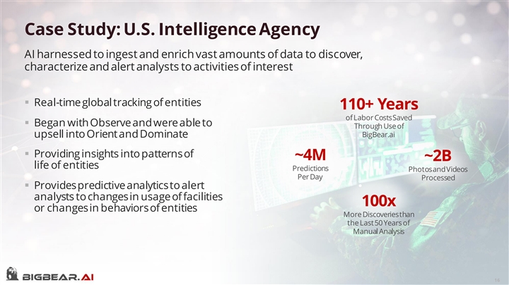 Existing Software Solutions Apply to Commercial Use Cases BigBear.ai's IP, originally designed for defense and intelligence customers, can be used today within a wide range of commercial applications across every industry vertical DEFENSE USE CASE EXAMPLES: COMMERCIAL USE CASE EXAMPLES: Location ▪ Discover new infrastructure being created▪ Predict the likelihood of disruptions at a location Intelligence ▪ Identify when a location’s use changes▪ Discover where competitors are operating ▪ Optimize trends effecting property value ▪ Predict human behaviors like security events ▪ Support refined site selection ▪ Process Satelliteand Internet of Things Data Space Energy ▪ Predict equipment failure to inform Maritime preventative maintenance ▪ Discover anomalous shipping behavior Intelligence ▪ Forecast demand for cargo capacity ▪ Predict the capacity of ports for future operations ▪ Optimize routing and fuel hedging strategy ▪ Characterize adversary maritime assets ➢ Forecast commodity and shipping prices ▪ Identify smuggling or piracy Logistics ➢ Optimize warehouse assortments Media ▪ Analyze sentiment towards brand or product ▪ Analyze sentiment towards U.S. interests Intelligence ▪ Optimize the impact of marketing campaigns ▪ Determine the differences between populations ▪ Identify and shape key influencers ▪ Identify propaganda and disinformation Federal Retail ▪ Predict the credit risk of individuals Civilian 15Existing Software Solutions Apply to Commercial Use Cases BigBear.ai's IP, originally designed for defense and intelligence customers, can be used today within a wide range of commercial applications across every industry vertical DEFENSE USE CASE EXAMPLES: COMMERCIAL USE CASE EXAMPLES: Location ▪ Discover new infrastructure being created▪ Predict the likelihood of disruptions at a location Intelligence ▪ Identify when a location’s use changes▪ Discover where competitors are operating ▪ Optimize trends effecting property value ▪ Predict human behaviors like security events ▪ Support refined site selection ▪ Process Satelliteand Internet of Things Data Space Energy ▪ Predict equipment failure to inform Maritime preventative maintenance ▪ Discover anomalous shipping behavior Intelligence ▪ Forecast demand for cargo capacity ▪ Predict the capacity of ports for future operations ▪ Optimize routing and fuel hedging strategy ▪ Characterize adversary maritime assets ➢ Forecast commodity and shipping prices ▪ Identify smuggling or piracy Logistics ➢ Optimize warehouse assortments Media ▪ Analyze sentiment towards brand or product ▪ Analyze sentiment towards U.S. interests Intelligence ▪ Optimize the impact of marketing campaigns ▪ Determine the differences between populations ▪ Identify and shape key influencers ▪ Identify propaganda and disinformation Federal Retail ▪ Predict the credit risk of individuals Civilian 15