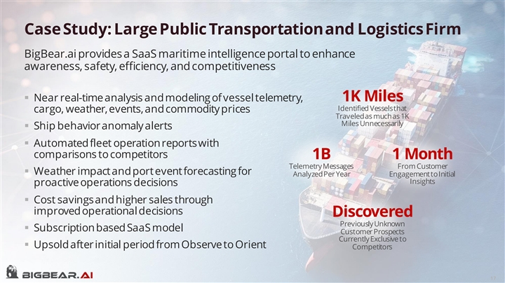 Case Study: U.S. Intelligence Agency AI harnessed to ingest and enrich vast amounts of data to discover, characterize and alert analysts to activities of interest ▪ Real-time global tracking of entities 110+ Years of Labor Costs Saved ▪ Began with Observe and were able to Through Use of BigBear.ai upsell into Orient and Dominate ▪ Providing insights into patterns of ~4M ~2B life of entities Predictions Photos and Videos Per Day Processed ▪ Provides predictive analytics to alert analysts to changes in usage of facilities 100x or changes in behaviors of entities More Discoveries than the Last 50 Years of Manual Analysis 16Case Study: U.S. Intelligence Agency AI harnessed to ingest and enrich vast amounts of data to discover, characterize and alert analysts to activities of interest ▪ Real-time global tracking of entities 110+ Years of Labor Costs Saved ▪ Began with Observe and were able to Through Use of BigBear.ai upsell into Orient and Dominate ▪ Providing insights into patterns of ~4M ~2B life of entities Predictions Photos and Videos Per Day Processed ▪ Provides predictive analytics to alert analysts to changes in usage of facilities 100x or changes in behaviors of entities More Discoveries than the Last 50 Years of Manual Analysis 16