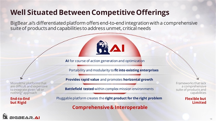 Well Situated Between Competitive Offerings BigBear.ai’s differentiated platform offers end-to-end integration with a comprehensive suite of products and capabilities to address unmet, critical needs AI for course of action generation and optimization Portability and modularity to fit into existing enterprises Provides rapid value and promotes horizontal growth Monolithic platforms that Frameworks that lack are difficult and expensive a comprehensive Battlefield tested within complex mission environments to integrate given “all or suite of products and nothing” approach capabilities Pluggable platform creates the right product for the right problem End-to-End Flexible but but Rigid Limited Comprehensive & Interoperable 18Well Situated Between Competitive Offerings BigBear.ai’s differentiated platform offers end-to-end integration with a comprehensive suite of products and capabilities to address unmet, critical needs AI for course of action generation and optimization Portability and modularity to fit into existing enterprises Provides rapid value and promotes horizontal growth Monolithic platforms that Frameworks that lack are difficult and expensive a comprehensive Battlefield tested within complex mission environments to integrate given “all or suite of products and nothing” approach capabilities Pluggable platform creates the right product for the right problem End-to-End Flexible but but Rigid Limited Comprehensive & Interoperable 18