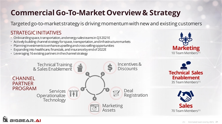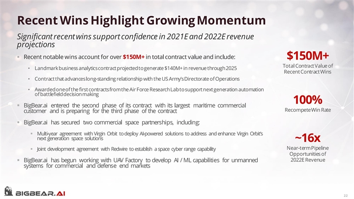 Commercial Go-To-Market Overview & Strategy Targeted go-to-market strategy is driving momentum with new and existing customers STRATEGIC INITIATIVES • Onboarding space, transportation, and energy sales teams in Q3 2021E • Actively building channel strategy for space, transportation, and infrastructure markets • Planning investments to enhance upselling and cross-selling opportunities Marketing • Expanding into healthcare, financials, and insurance by end of 2022E (1) 10 Team Members • Leveraging 16 existing partners in the channel strategy Incentives & Technical Training Discounts & Sales Enablement Technical Sales 1 2 Enablement CHANNEL (1) 35 Team Members PARTNER 5 PROGRAM 3 Deal Services Registration Operationalize 4 Technology Marketing Sales (1) Assets 70 Team Members (1) Estimated team size by 2025. 21Commercial Go-To-Market Overview & Strategy Targeted go-to-market strategy is driving momentum with new and existing customers STRATEGIC INITIATIVES • Onboarding space, transportation, and energy sales teams in Q3 2021E • Actively building channel strategy for space, transportation, and infrastructure markets • Planning investments to enhance upselling and cross-selling opportunities Marketing • Expanding into healthcare, financials, and insurance by end of 2022E (1) 10 Team Members • Leveraging 16 existing partners in the channel strategy Incentives & Technical Training Discounts & Sales Enablement Technical Sales 1 2 Enablement CHANNEL (1) 35 Team Members PARTNER 5 PROGRAM 3 Deal Services Registration Operationalize 4 Technology Marketing Sales (1) Assets 70 Team Members (1) Estimated team size by 2025. 21