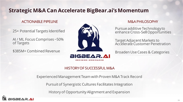 Strategic M&A Can Accelerate BigBear.ai’s Momentum ACTIONABLE PIPELINE M&A PHILOSOPHY Pursue additive Technology to 25+ Potential Targets Identified enhance Cross-Sell Opportunities AI / ML Focus Comprises ~50% Target Adjacent Markets to of Targets Accelerate Customer Penetration $385M+ Combined Revenue Broaden Use Cases & Categories HISTORY OF SUCCESSFUL M&A Experienced Management Team with Proven M&A Track Record Pursuit of Synergistic Cultures Facilitates Integration History of Opportunity Alignment and Expansion 26Strategic M&A Can Accelerate BigBear.ai’s Momentum ACTIONABLE PIPELINE M&A PHILOSOPHY Pursue additive Technology to 25+ Potential Targets Identified enhance Cross-Sell Opportunities AI / ML Focus Comprises ~50% Target Adjacent Markets to of Targets Accelerate Customer Penetration $385M+ Combined Revenue Broaden Use Cases & Categories HISTORY OF SUCCESSFUL M&A Experienced Management Team with Proven M&A Track Record Pursuit of Synergistic Cultures Facilitates Integration History of Opportunity Alignment and Expansion 26