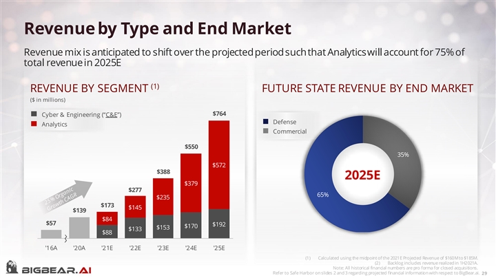 Revenue by Type and End Market Revenue mix is anticipated to shift over the projected period such that Analytics will account for 75% of total revenue in 2025E (1) REVENUE BY SEGMENT FUTURE STATE REVENUE BY END MARKET ($ in millions) $764 Cyber & Engineering (“C&E”) Defense Analytics Commercial $550 35% $572 $388 2025E $379 $277 65% $235 $173 $145 $139 $84 $57 $192 $170 $153 $133 $88 '16A '20A '21E '22E '23E '24E '25E (1) Calculated using the midpoint of the 2021E Projected Revenue of $160M to $185M. (2) Backlog includes revenue realized in 1H2021A. Note: All historical financial numbers are pro forma for closed acquisitions. Refer to Safe Harbor on slides 2 and 3 regarding projected financial information with respect to BigBear.ai. 29Revenue by Type and End Market Revenue mix is anticipated to shift over the projected period such that Analytics will account for 75% of total revenue in 2025E (1) REVENUE BY SEGMENT FUTURE STATE REVENUE BY END MARKET ($ in millions) $764 Cyber & Engineering (“C&E”) Defense Analytics Commercial $550 35% $572 $388 2025E $379 $277 65% $235 $173 $145 $139 $84 $57 $192 $170 $153 $133 $88 '16A '20A '21E '22E '23E '24E '25E (1) Calculated using the midpoint of the 2021E Projected Revenue of $160M to $185M. (2) Backlog includes revenue realized in 1H2021A. Note: All historical financial numbers are pro forma for closed acquisitions. Refer to Safe Harbor on slides 2 and 3 regarding projected financial information with respect to BigBear.ai. 29