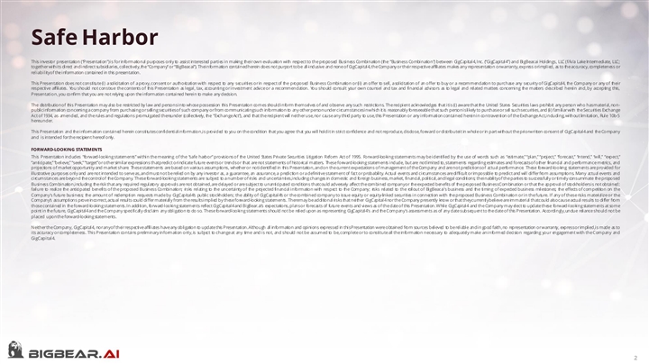 Safe Harbor This investor presentation (“Presentation”)is forinformational purposes only to assist interested parties in making theirown evaluation with respect to theproposed Business Combination (the “Business Combination”) between GigCapital4,Inc. (“GigCapital4”) and BigBear.ai Holdings, LLC (f/k/a LakeIntermediate, LLC; togetherwithits direct andindirect subsidiaries,collectively,the“Company”or“BigBear.ai”). Theinformation containedherein does not purport tobe all-inclusive and noneof GigCapital4,theCompanyortheirrespectiveaffiliates makes any representation orwarranty,express orimplied, as to theaccuracy,completeness or reliabilityof theinformation contained in this presentation. This Presentation does not constitute(i) asolicitation of aproxy,consentor authorization with respect to any securities or in respect of the proposed Business Combination or(ii) an offer to sell, asolicitation of an offer to buyor a recommendation to purchase any securityof GigCapital4, the Company or anyof their respective affiliates. You should not construe thecontents of this Presentation as legal, tax, accountingorinvestment adviceor a recommendation. You should consult your own counsel and tax and financial advisors as to legal and related matters concerning the matters described herein and,by accepting this, Presentation,you confirm that you are not relying upon theinformation contained herein to make any decision. The distributionof this Presentation may also be restricted by law and personsinto whosepossession this Presentation comes shouldinform themselves of and observe any such restrictions. Therecipient acknowledges thatitis (i) awarethat the United States Securities laws prohibit any person who hasmaterial,non- publicinformation concerningacompany from purchasingorsellingsecuritiesof such company orfrom communicatingsuch information to any otherpersonundercircumstancesinwhich it is reasonably foreseeablethat such personislikely to purchaseorsell suchsecurities,and (ii) familiarwith theSecurities Exchange Actof 1934, as amended, and therules and regulations promulgated thereunder (collectively, the “ExchangeAct”), and that therecipient will neitheruse,nor causeany third party to use,this Presentation or any information contained hereinin contravention of theExchangeAct,including,withoutlimitation, Rule 10b-5 hereunder. This Presentation and theinformation contained herein constitutesconfidentialinformation,is provided to you on thecondition that you agree that you will holdit in strict confidence and not reproduce,disclose,forward ordistributeit in wholeor in part without thepriorwritten consent of GigCapital4and theCompany and is intended fortherecipient hereof only. FORWARD-LOOKING STATEMENTS This Presentation includes forward-lookingstatements” within themeaning of the safe harbor provisionsof the United States Private Securities Litigation Reform Actof 1995. Forward-lookingstatements may beidentified by the use of words such as “estimate,” “plan,” “project,” “forecast,” “intend,” “will,” “expect,” “anticipate,” “believe,” “seek,” “target”orothersimilarexpressions thatpredictorindicatefuture eventsor trendsor that arenot statements of historical matters. Theseforward-lookingstatements include, but are notlimited to,statements regardingestimates and forecastsof other financial and performancemetrics, and projections of market opportunity and market share. Thesestatements arebased on various assumptions, whetheror notidentified in this Presentation,andon thecurrent expectations of managementof theCompany and arenot predictionsof actual performance. These forward-looking statements areprovided for illustrative purposes only and arenot intended to serveas,andmust notberelied on by any investor as, a guarantee, an assurance,a prediction oradefinitivestatement of factorprobability. Actual events and circumstances aredifficultorimpossible to predict and will differfrom assumptions. Many actual events and circumstances arebeyond thecontrolof theCompany. Theseforward-lookingstatements are subject to anumberof risks and uncertainties,includingchanges in domestic and foreign business,market, financial,political,andlegal conditions; theinabilityof theparties to successfully ortimely consummate theproposed Business Combination,including therisk that any required regulatory approvals arenot obtained,aredelayed oraresubject to unanticipated conditions thatcould adversely affect thecombined companyor theexpected benefits of theproposed BusinessCombination orthat the approval of stockholdersis not obtained; failure to realize the anticipated benefits of theproposed Business Combination; risks relating to the uncertainty of the projected financial information with respect to the Company; risks related to the rolloutof BigBear.ai's business and the timing of expected business milestones; the effects of competition on the Company's future business; the amountof redemption requests madeby GigCapital4 's public stockholders; the ability of GigCapital4’s or thecombined company to issue equity or equity-linked securities in connection with theproposed Business Combination orin thefuture. If any of theserisks materializeor the Company’s assumptions proveincorrect,actual results could differmaterially from theresultsimplied by theseforward-lookingstatements. Theremay beadditional risks that neither GigCapital4northeCompany presently know orthat theycurrentlybelieveareimmaterial thatcould alsocauseactual results to differ from thosecontained in theforward-lookingstatements.In addition, forward-lookingstatements reflect GigCapital4and BigBear.ais ’ expectations,plansor forecasts of future events and views as of thedateof this Presentation.While GigCapital4 and theCompany may elect to updatethese forward-lookingstatements at some pointin thefuture, GigCapital4and theCompany specifically disclaim any obligation to do so. Theseforward-lookingstatem