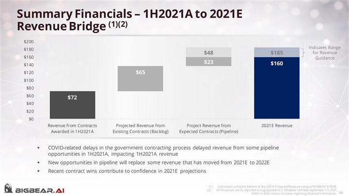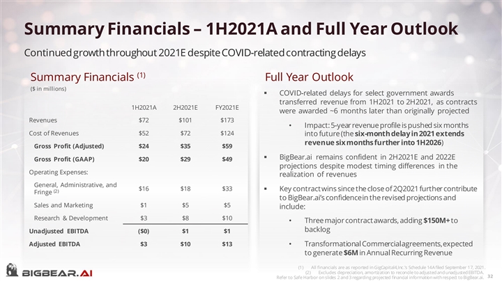 Summary Financials – 1H2021A and Full Year Outlook Continued growth throughout 2021E despite COVID-related contracting delays (1) Summary Financials Full Year Outlook ($ in millions) ▪ COVID-related delays for select government awards transferred revenue from 1H2021 to 2H2021, as contracts 1H2021A 2H2021E FY2021E were awarded ~6 months later than originally projected Revenues $72 $101 $173 • Impact: 5-year revenue profile is pushed six months Cost of Revenues $52 $72 $124 into future (the six-month delay in 2021 extends revenue six months further into 1H2026) Gross Profit (Adjusted) $24 $35 $59 ▪ BigBear.ai remains confident in 2H2021E and 2022E Gross Profit (GAAP) $20 $29 $49 projections despite modest timing differences in the Operating Expenses: realization of revenues General, Administrative, and $16 $18 $33 ▪ Key contract wins since the close of 2Q2021 further contribute (2) Fringe to BigBear.ai’s confidence in the revised projections and Sales and Marketing $1 $5 $5 include: Research & Development $3 $8 $10 • Three major contract awards, adding $150M+to backlog Unadjusted EBITDA ($0) $1 $1 Adjusted EBITDA $3 $10 $13• Transformational Commercial agreements, expected to generate $6Min Annual Recurring Revenue (1) All financials are as reported in GigCapital4,Inc.’s Schedule 14A filed September 17, 2021. (2) Excludes depreciation, amortization to reconcile to adjusted and unadjusted EBITDA. 32 Refer to Safe Harbor on slides 2 and 3 regarding projected financial information with respect to BigBear.ai.Summary Financials – 1H2021A and Full Year Outlook Continued growth throughout 2021E despite COVID-related contracting delays (1) Summary Financials Full Year Outlook ($ in millions) ▪ COVID-related delays for select government awards transferred revenue from 1H2021 to 2H2021, as contracts 1H2021A 2H2021E FY2021E were awarded ~6 months later than originally projected Revenues $72 $101 $173 • Impact: 5-year revenue profile is pushed six months Cost of Revenues $52 $72 $124 into future (the six-month delay in 2021 extends revenue six months further into 1H2026) Gross Profit (Adjusted) $24 $35 $59 ▪ BigBear.ai remains confident in 2H2021E and 2022E Gross Profit (GAAP) $20 $29 $49 projections despite modest timing differences in the Operating Expenses: realization of revenues General, Administrative, and $16 $18 $33 ▪ Key contract wins since the close of 2Q2021 further contribute (2) Fringe to BigBear.ai’s confidence in the revised projections and Sales and Marketing $1 $5 $5 include: Research & Development $3 $8 $10 • Three major contract awards, adding $150M+to backlog Unadjusted EBITDA ($0) $1 $1 Adjusted EBITDA $3 $10 $13• Transformational Commercial agreements, expected to generate $6Min Annual Recurring Revenue (1) All financials are as reported in GigCapital4,Inc.’s Schedule 14A filed September 17, 2021. (2) Excludes depreciation, amortization to reconcile to adjusted and unadjusted EBITDA. 32 Refer to Safe Harbor on slides 2 and 3 regarding projected financial information with respect to BigBear.ai.