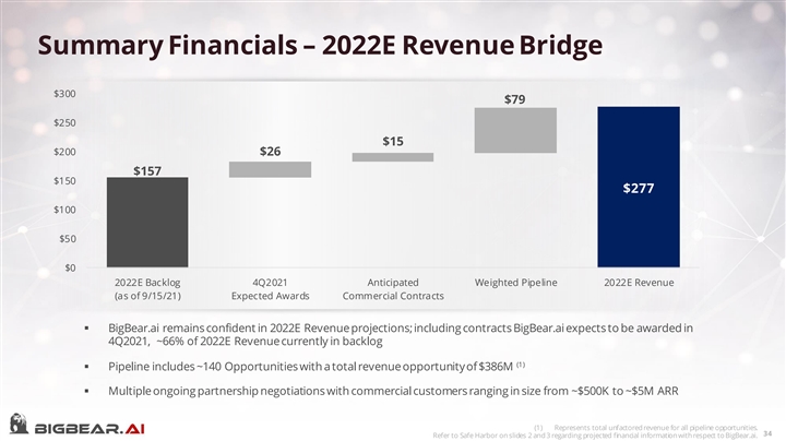 Summary Financials – 1H2021A to 2021E (1)(2) Revenue Bridge $200 Indicates Range $180 for Revenue $48 $185 $160 Guidance $23 $160 $140 $120 $65 $100 $80 $60 $72 $40 $20 $0 Revenue from Contracts Projected Revenue from Project Revenue from 2021E Revenue Awarded in 1H2021A Existing Contracts (Backlog) Expected Contracts (Pipeline) ▪ COVID-related delays in the government contracting process delayed revenue from some pipeline opportunities in 1H2021A, impacting 1H2021A revenue ▪ New opportunities in pipeline will replace some revenue that has moved from 2021E to 2022E ▪ Recent contract wins contribute to confidence in 2021E projections (1) Calculated using the bottom of the 2021E Projected Revenue range of $160M to $185M. (2) All financials are as reported in GigCapital4,Inc.’s Schedule 14A filed September 17, 2021. 33 Refer to Safe Harbor on cover regarding financial information. Summary Financials – 1H2021A to 2021E (1)(2) Revenue Bridge $200 Indicates Range $180 for Revenue $48 $185 $160 Guidance $23 $160 $140 $120 $65 $100 $80 $60 $72 $40 $20 $0 Revenue from Contracts Projected Revenue from Project Revenue from 2021E Revenue Awarded in 1H2021A Existing Contracts (Backlog) Expected Contracts (Pipeline) ▪ COVID-related delays in the government contracting process delayed revenue from some pipeline opportunities in 1H2021A, impacting 1H2021A revenue ▪ New opportunities in pipeline will replace some revenue that has moved from 2021E to 2022E ▪ Recent contract wins contribute to confidence in 2021E projections (1) Calculated using the bottom of the 2021E Projected Revenue range of $160M to $185M. (2) All financials are as reported in GigCapital4,Inc.’s Schedule 14A filed September 17, 2021. 33 Refer to Safe Harbor on cover regarding financial information.