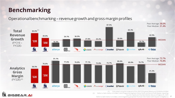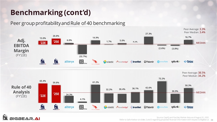 Benchmarking Operational benchmarking – revenue growth and gross margin profiles Peer Average: 38.6% 87.5% Peer Median: 31.4% (1) 65.3% 60.6% Total 42.5% Revenue 39.0% 36.9% 34.1% 28.6% 27.8% 25.2% Growth MEDIAN ’22E 19.7% 18.4% (FY’21E – ’25E FY’22E) Peer Average: 73.7% 91.1% Peer Median: 76.8% 80.6% 77.6% 77.1% 76.8% 69.0% 76.7% 73.7% 72.8% 70.6% MEDIAN 58.5% Analytics 41.2% Gross ’25E Margin ’22E (2) (FY’22E) (1) Calculated using the midpoint of the 2021E Projected Revenue of $160M to $185M. (2) Refer to Safe Harbor on slides 2 and 3 regarding Segment Gross Profit and Gross Profit Margin reporting. Source: CapIQ and FactSet; Market data as of August 31, 2021. 37 Refer to Safe Harbor on slides 2 and 3 regarding projected financial information with respect to BigBear.ai.Benchmarking Operational benchmarking – revenue growth and gross margin profiles Peer Average: 38.6% 87.5% Peer Median: 31.4% (1) 65.3% 60.6% Total 42.5% Revenue 39.0% 36.9% 34.1% 28.6% 27.8% 25.2% Growth MEDIAN ’22E 19.7% 18.4% (FY’21E – ’25E FY’22E) Peer Average: 73.7% 91.1% Peer Median: 76.8% 80.6% 77.6% 77.1% 76.8% 69.0% 76.7% 73.7% 72.8% 70.6% MEDIAN 58.5% Analytics 41.2% Gross ’25E Margin ’22E (2) (FY’22E) (1) Calculated using the midpoint of the 2021E Projected Revenue of $160M to $185M. (2) Refer to Safe Harbor on slides 2 and 3 regarding Segment Gross Profit and Gross Profit Margin reporting. Source: CapIQ and FactSet; Market data as of August 31, 2021. 37 Refer to Safe Harbor on slides 2 and 3 regarding projected financial information with respect to BigBear.ai.