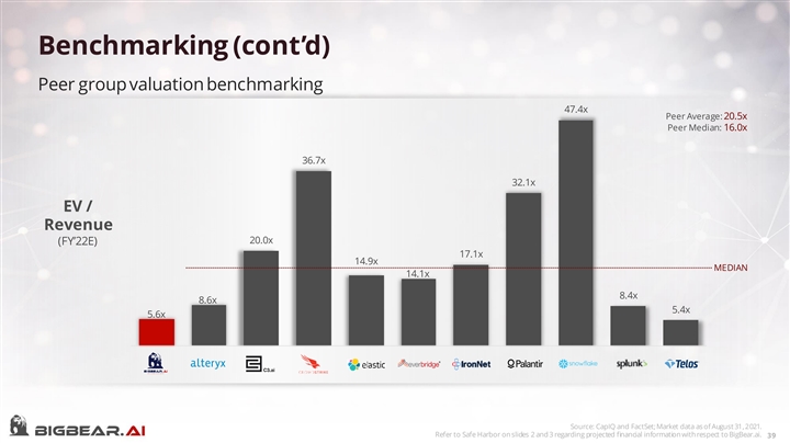Benchmarking (cont’d) Peer group profitability and Rule of 40 benchmarking Peer Average: 3.3% Peer Median: 3.4% 27.3% 20.8% 16.7% 14.9% 13.0% 6.0% 5.0% Adj. 1.7% n.m. ’25E MEDIAN ’22E EBITDA (2.6%) (3.8%) Margin (FY’22E) (32.7%) Peer Average: 38.5% Peer Median: 34.2% 73.2% 65.4% 61.2% 59.8% 50.3% Rule of 40 42.6% 36.1% 30.4% 32.2% 30.9% Analysis MEDIAN ’25E 24.3% ’22E (FY’22E) 4.1% Source: CapIQ and FactSet; Market data as of August 31, 2021. Refer to Safe Harbor on slides 2 and 3 regarding projected financial information with respect to BigBear.ai. 38Benchmarking (cont’d) Peer group profitability and Rule of 40 benchmarking Peer Average: 3.3% Peer Median: 3.4% 27.3% 20.8% 16.7% 14.9% 13.0% 6.0% 5.0% Adj. 1.7% n.m. ’25E MEDIAN ’22E EBITDA (2.6%) (3.8%) Margin (FY’22E) (32.7%) Peer Average: 38.5% Peer Median: 34.2% 73.2% 65.4% 61.2% 59.8% 50.3% Rule of 40 42.6% 36.1% 30.4% 32.2% 30.9% Analysis MEDIAN ’25E 24.3% ’22E (FY’22E) 4.1% Source: CapIQ and FactSet; Market data as of August 31, 2021. Refer to Safe Harbor on slides 2 and 3 regarding projected financial information with respect to BigBear.ai. 38