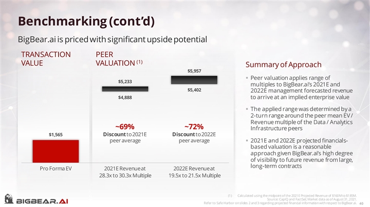 Benchmarking (cont’d) Peer group valuation benchmarking 47.4x Peer Average: 20.5x Peer Median: 16.0x 36.7x 32.1x EV / Revenue 20.0x (FY’22E) 17.1x 14.9x MEDIAN 14.1x 8.4x 8.6x 5.4x 5.6x Source: CapIQ and FactSet; Market data as of August 31, 2021. Refer to Safe Harbor on slides 2 and 3 regarding projected financial information with respect to BigBear.ai. 39Benchmarking (cont’d) Peer group valuation benchmarking 47.4x Peer Average: 20.5x Peer Median: 16.0x 36.7x 32.1x EV / Revenue 20.0x (FY’22E) 17.1x 14.9x MEDIAN 14.1x 8.4x 8.6x 5.4x 5.6x Source: CapIQ and FactSet; Market data as of August 31, 2021. Refer to Safe Harbor on slides 2 and 3 regarding projected financial information with respect to BigBear.ai. 39