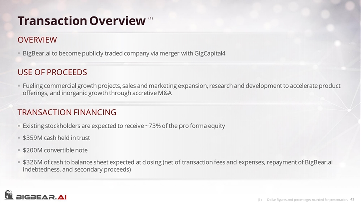 (1) PRO FORMA VALUATION Transaction Detail $ IN MILLIONS Share Price $10.00 TRANSACTION HIGHLIGHTS Shares Outstanding (M) 169.7 Equity Value $1,697 ▪ PF Enterprise Value of $1,565M, implying an EV / FY2022E revenue multiple of 5.6x (3) Less: Net Cash (132) ▪ Current BigBear.ai stockholders to retain ~73% of pro forma equity Enterprise Value $1,565 (4) EV / 2021E Revenue 9.1x ▪ Raised $200M convertible note EV / 2022E Revenue 5.6x ▪ 100% of BigBear.ai’s existing debt of $109M will be paid down in transaction ILLUSTRATIVE SOURCES & USES $ IN MILLIONS ▪ Transaction expected to be completed in Q4 2021 Sources $ % Seller Equity Roll-Over $1,237 68.9% (2) PRO FORMA BASIC OWNERSHIP % Cash in Trust 359 20.0% (5) Founders / Insiders Convertible Note Proceeds 200 11.1% 5.9% Total Sources $1,796 100.0% GigCapital4 IPO Investors Uses $ % 21.1% Seller Equity Roll-Over $1,237 68.9% Cash to Sellers 75 4.2% Existing Cash to Balance Sheet 326 18.2% Shareholders Pay Down Debt 110 6.1% 72.9% (6) Estimated Fees & Expenses 48 2.7% Total Uses $1,796 100.0% (1) Dollar figures and percentages rounded for presentation. (2) Founders / Insiders includes Founder Shares and Private Placement Units issued to sponsor and underwriter. (3) Existing BigBear.ai cash of ~$9M, cash in trust of ~$359M, cash from convertible note of $200M, less fees of ~$48M, existing debt of ~$110M, secondary of $75M, and convertible debt of $200M. (4) Calculated using the midpoint of the 2021E Projected Revenue of $160M to $185M. (5) $200M convertible note bearing a coupon of 6.0% and a conversion price of $11.50. Mandatory conversion: after August 15, 2022if share price exceeds 130% of the conversion price for 20 of 30 consecutive trading days. (6) Subject to change. Refer to Safe Harbor on slides 2 and 3 regarding projected financial information with respect to BigBear.ai. 43(1) PRO FORMA VALUATION Transaction Detail $ IN MILLIONS Share Price $10.00 TRANSACTION HIGHLIGHTS Shares Outstanding (M) 169.7 Equity Value $1,697 ▪ PF Enterprise Value of $1,565M, implying an EV / FY2022E revenue multiple of 5.6x (3) Less: Net Cash (132) ▪ Current BigBear.ai stockholders to retain ~73% of pro forma equity Enterprise Value $1,565 (4) EV / 2021E Revenue 9.1x ▪ Raised $200M convertible note EV / 2022E Revenue 5.6x ▪ 100% of BigBear.ai’s existing debt of $109M will be paid down in transaction ILLUSTRATIVE SOURCES & USES $ IN MILLIONS ▪ Transaction expected to be completed in Q4 2021 Sources $ % Seller Equity Roll-Over $1,237 68.9% (2) PRO FORMA BASIC OWNERSHIP % Cash in Trust 359 20.0% (5) Founders / Insiders Convertible Note Proceeds 200 11.1% 5.9% Total Sources $1,796 100.0% GigCapital4 IPO Investors Uses $ % 21.1% Seller Equity Roll-Over $1,237 68.9% Cash to Sellers 75 4.2% Existing Cash to Balance Sheet 326 18.2% Shareholders Pay Down Debt 110 6.1% 72.9% (6) Estimated Fees & Expenses 48 2.7% Total Uses $1,796 100.0% (1) Dollar figures and percentages rounded for presentation. (2) Founders / Insiders includes Founder Shares and Private Placement Units issued to sponsor and underwriter. (3) Existing BigBear.ai cash of ~$9M, cash in trust of ~$359M, cash from convertible note of $200M, less fees of ~$48M, existing debt of ~$110M, secondary of $75M, and convertible debt of $200M. (4) Calculated using the midpoint of the 2021E Projected Revenue of $160M to $185M. (5) $200M convertible note bearing a coupon of 6.0% and a conversion price of $11.50. Mandatory conversion: after August 15, 2022if share price exceeds 130% of the conversion price for 20 of 30 consecutive trading days. (6) Subject to change. Refer to Safe Harbor on slides 2 and 3 regarding projected financial information with respect to BigBear.ai. 43