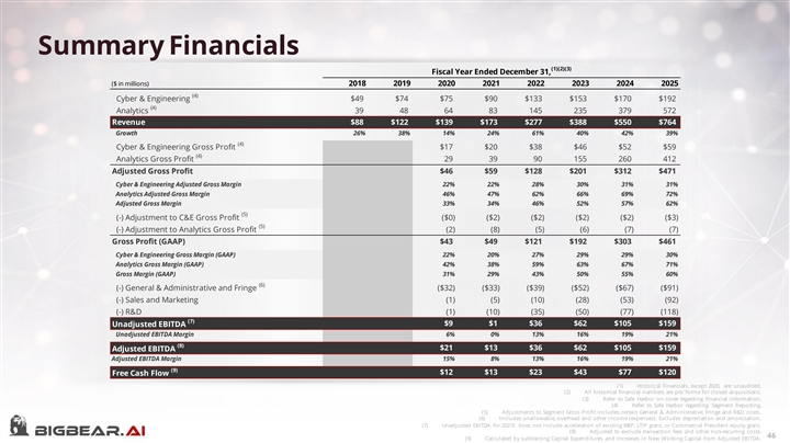 Summary Financials (1)(2)(3) Fiscal Year Ended December 31, ($ in millions) 2018 2019 2020 2021 2022 2023 2024 2025 (4) Cyber & Engineering $49 $74 $75 $90 $133 $153 $170 $192 (4) Analytics 39 48 64 83 145 235 379 572 Revenue $88 $122 $139 $173 $277 $388 $550 $764 Growth 26% 38% 14% 24% 61% 40% 42% 39% (4) Cyber & Engineering Gross Profit $17 $20 $38 $46 $52 $59 (4) Analytics Gross Profit 29 39 90 155 260 412 Adjusted Gross Profit $46 $59 $128 $201 $312 $471 Cyber & Engineering Adjusted Gross Margin 22% 22% 28% 30% 31% 31% Analytics Adjusted Gross Margin 46% 47% 62% 66% 69% 72% Adjusted Gross Margin 33% 34% 46% 52% 57% 62% (5) (-) Adjustment to C&E Gross Profit ($0) ($2) ($2) ($2) ($2) ($3) (5) (-) Adjustment to Analytics Gross Profit (2) (8) (5) (6) (7) (7) Gross Profit (GAAP) $43 $49 $121 $192 $303 $461 Cyber & Engineering Gross Margin (GAAP) 22% 20% 27% 29% 29% 30% Analytics Gross Margin (GAAP) 42% 38% 59% 63% 67% 71% Gross Margin (GAAP) 31% 29% 43% 50% 55% 60% (6) (-) General & Administrative and Fringe ($32) ($33) ($39) ($52) ($67) ($91) (-) Sales and Marketing (1) (5) (10) (28) (53) (92) (-) R&D (1) (10) (35) (50) (77) (118) (7) $9 $1 $36 $62 $105 $159 Unadjusted EBITDA Unadjusted EBITDA Margin 6% 0% 13% 16% 19% 21% (8) $21 $13 $36 $62 $105 $159 Adjusted EBITDA Adjusted EBITDA Margin 15% 8% 13% 16% 19% 21% (9) $12 $13 $23 $43 $77 $120 Free Cash Flow (1) Historical Financials, except 2020, are unaudited. (2) All historical financial numbers are pro forma for closed acquisitions. (3) Refer to Safe Harbor on cover regarding financial information. (4) Refer to Safe Harbor regarding Segment Reporting. (5) Adjustments to Segment Gross Profit includes certain General & Administrative, Fringe and R&D costs. (6) Includes unallowable, overhead and other income (expenses). Excludes depreciation and amortization. (7) Unadjusted EBITDA for 2021E does not include acceleration of existing MEP, LTIP grant, or Commercial President equity grant. (8) Adjusted to exclude transaction fees and other non-recurring costs. 46 (9) Calculated by subtracting Capital Expenditures and Increases in New Working Capital from Adjusted EBITDA.Summary Financials (1)(2)(3) Fiscal Year Ended December 31, ($ in millions) 2018 2019 2020 2021 2022 2023 2024 2025 (4) Cyber & Engineering $49 $74 $75 $90 $133 $153 $170 $192 (4) Analytics 39 48 64 83 145 235 379 572 Revenue $88 $122 $139 $173 $277 $388 $550 $764 Growth 26% 38% 14% 24% 61% 40% 42% 39% (4) Cyber & Engineering Gross Profit $17 $20 $38 $46 $52 $59 (4) Analytics Gross Profit 29 39 90 155 260 412 Adjusted Gross Profit $46 $59 $128 $201 $312 $471 Cyber & Engineering Adjusted Gross Margin 22% 22% 28% 30% 31% 31% Analytics Adjusted Gross Margin 46% 47% 62% 66% 69% 72% Adjusted Gross Margin 33% 34% 46% 52% 57% 62% (5) (-) Adjustment to C&E Gross Profit ($0) ($2) ($2) ($2) ($2) ($3) (5) (-) Adjustment to Analytics Gross Profit (2) (8) (5) (6) (7) (7) Gross Profit (GAAP) $43 $49 $121 $192 $303 $461 Cyber & Engineering Gross Margin (GAAP) 22% 20% 27% 29% 29% 30% Analytics Gross Margin (GAAP) 42% 38% 59% 63% 67% 71% Gross Margin (GAAP) 31% 29% 43% 50% 55% 60% (6) (-) General & Administrative and Fringe ($32) ($33) ($39) ($52) ($67) ($91) (-) Sales and Marketing (1) (5) (10) (28) (53) (92) (-) R&D (1) (10) (35) (50) (77) (118) (7) $9 $1 $36 $62 $105 $159 Unadjusted EBITDA Unadjusted EBITDA Margin 6% 0% 13% 16% 19% 21% (8) $21 $13 $36 $62 $105 $159 Adjusted EBITDA Adjusted EBITDA Margin 15% 8% 13% 16% 19% 21% (9) $12 $13 $23 $43 $77 $120 Free Cash Flow (1) Historical Financials, except 2020, are unaudited. (2) All historical financial numbers are pro forma for closed acquisitions. (3) Refer to Safe Harbor on cover regarding financial information. (4) Refer to Safe Harbor regarding Segment Reporting. (5) Adjustments to Segment Gross Profit includes certain General & Administrative, Fringe and R&D costs. (6) Includes unallowable, overhead and other income (expenses). Excludes depreciation and amortization. (7) Unadjusted EBITDA for 2021E does not include acceleration of existing MEP, LTIP grant, or Commercial President equity grant. (8) Adjusted to exclude transaction fees and other non-recurring costs. 46 (9) Calculated by subtracting Capital Expenditures and Increases in New Working Capital from Adjusted EBITDA.