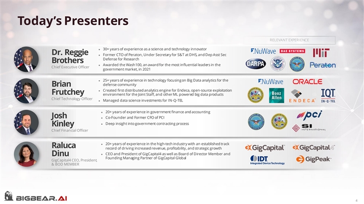 Today’s Presenters RELEVANT EXPERIENCE ⚫ 30+ years of experience as a science and technology innovator Dr. Reggie ⚫ Former CTO of Peraton, Under Secretary for S&T at DHS, and Dep Asst Sec Defense for Research Brothers ⚫ Awarded the Wash100, an award for the most influential leaders in the Chief Executive Officer government market, in 2021 ⚫ 25+ years of experience in technology focusing on Big Data analytics for the defense community Brian ⚫ Created first distributed analytics engine for Endeca, open-source exploitation Frutchey environment for the Joint Staff, and other ML powered big data products Chief Technology Officer ⚫ Managed data science investments for IN-Q-TEL ⚫ 20+ years of experience in government finance and accounting Josh ⚫ Co-Founder and Former CFO of PCI ⚫ Deep insight into government contracting process Kinley Chief Financial Officer ⚫ 20+ years of experience in the high-tech industry with an established track Raluca record of driving increased revenue, profitability, and strategic growth ⚫ CEO and President of GigCapital4 as well as Board of Director Member and Dinu Founding Managing Partner of GigCapital Global GigCapital4 CEO, President, & BOD MEMBER 4Today’s Presenters RELEVANT EXPERIENCE ⚫ 30+ years of experience as a science and technology innovator Dr. Reggie ⚫ Former CTO of Peraton, Under Secretary for S&T at DHS, and Dep Asst Sec Defense for Research Brothers ⚫ Awarded the Wash100, an award for the most influential leaders in the Chief Executive Officer government market, in 2021 ⚫ 25+ years of experience in technology focusing on Big Data analytics for the defense community Brian ⚫ Created first distributed analytics engine for Endeca, open-source exploitation Frutchey environment for the Joint Staff, and other ML powered big data products Chief Technology Officer ⚫ Managed data science investments for IN-Q-TEL ⚫ 20+ years of experience in government finance and accounting Josh ⚫ Co-Founder and Former CFO of PCI ⚫ Deep insight into government contracting process Kinley Chief Financial Officer ⚫ 20+ years of experience in the high-tech industry with an established track Raluca record of driving increased revenue, profitability, and strategic growth ⚫ CEO and President of GigCapital4 as well as Board of Director Member and Dinu Founding Managing Partner of GigCapital Global GigCapital4 CEO, President, & BOD MEMBER 4