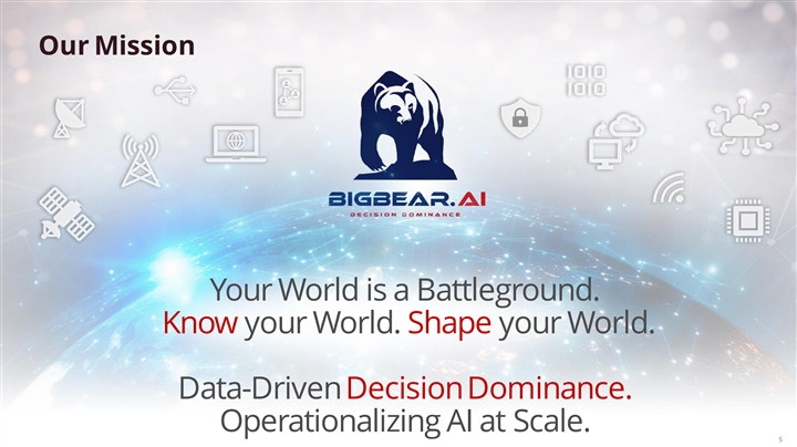 Our Mission Your World is a Battleground. Know your World. Shape your World. Data-Driven Decision Dominance. Operationalizing AI at Scale. 5Our Mission Your World is a Battleground. Know your World. Shape your World. Data-Driven Decision Dominance. Operationalizing AI at Scale. 5