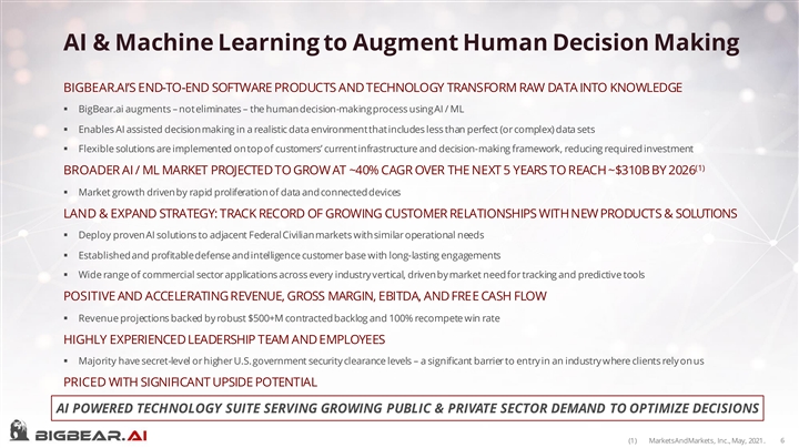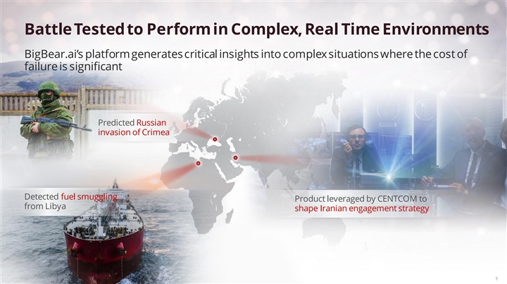 AI & Machine Learning to Augment Human Decision Making BIGBEAR.AI’S END-TO-END SOFTWARE PRODUCTS AND TECHNOLOGY TRANSFORM RAW DATA INTO KNOWLEDGE ▪ BigBear.ai augments – not eliminates – the human decision-making process using AI / ML ▪ Enables AI assisted decision making in a realistic data environment that includes less than perfect (or complex) data sets ▪ Flexible solutions are implemented on top of customers’ current infrastructure and decision-making framework, reducing required investment (1) BROADER AI / ML MARKET PROJECTED TO GROW AT ~40% CAGR OVER THE NEXT 5 YEARS TO REACH ~$310B BY 2026 ▪ Market growth driven by rapid proliferation of data and connected devices LAND & EXPAND STRATEGY: TRACK RECORD OF GROWING CUSTOMER RELATIONSHIPS WITH NEW PRODUCTS & SOLUTIONS ▪ Deploy proven AI solutions to adjacent Federal Civilian markets with similar operational needs ▪ Established and profitable defense and intelligence customer base with long-lasting engagements ▪ Wide range of commercial sector applications across every industry vertical, driven by market need for tracking and predictive tools POSITIVE AND ACCELERATING REVENUE, GROSS MARGIN, EBITDA, AND FREE CASH FLOW ▪ Revenue projections backed by robust $500+M contracted backlog and 100% recompete win rate HIGHLY EXPERIENCED LEADERSHIP TEAM AND EMPLOYEES ▪ Majority have secret-level or higher U.S. government security clearance levels – a significant barrier to entry in an industry where clients rely on us PRICED WITH SIGNIFICANT UPSIDE POTENTIAL AI POWERED TECHNOLOGY SUITE SERVING GROWING PUBLIC & PRIVATE SECTOR DEMAND TO OPTIMIZE DECISIONS (1) MarketsAndMarkets, Inc., May, 2021. 6AI & Machine Learning to Augment Human Decision Making BIGBEAR.AI’S END-TO-END SOFTWARE PRODUCTS AND TECHNOLOGY TRANSFORM RAW DATA INTO KNOWLEDGE ▪ BigBear.ai augments – not eliminates – the human decision-making process using AI / ML ▪ Enables AI assisted decision making in a realistic data environment that includes less than perfect (or complex) data sets ▪ Flexible solutions are implemented on top of customers’ current infrastructure and decision-making framework, reducing required investment (1) BROADER AI / ML MARKET PROJECTED TO GROW AT ~40% CAGR OVER THE NEXT 5 YEARS TO REACH ~$310B BY 2026 ▪ Market growth driven by rapid proliferation of data and connected devices LAND & EXPAND STRATEGY: TRACK RECORD OF GROWING CUSTOMER RELATIONSHIPS WITH NEW PRODUCTS & SOLUTIONS ▪ Deploy proven AI solutions to adjacent Federal Civilian markets with similar operational needs ▪ Established and profitable defense and intelligence customer base with long-lasting engagements ▪ Wide range of commercial sector applications across every industry vertical, driven by market need for tracking and predictive tools POSITIVE AND ACCELERATING REVENUE, GROSS MARGIN, EBITDA, AND FREE CASH FLOW ▪ Revenue projections backed by robust $500+M contracted backlog and 100% recompete win rate HIGHLY EXPERIENCED LEADERSHIP TEAM AND EMPLOYEES ▪ Majority have secret-level or higher U.S. government security clearance levels – a significant barrier to entry in an industry where clients rely on us PRICED WITH SIGNIFICANT UPSIDE POTENTIAL AI POWERED TECHNOLOGY SUITE SERVING GROWING PUBLIC & PRIVATE SECTOR DEMAND TO OPTIMIZE DECISIONS (1) MarketsAndMarkets, Inc., May, 2021. 6
