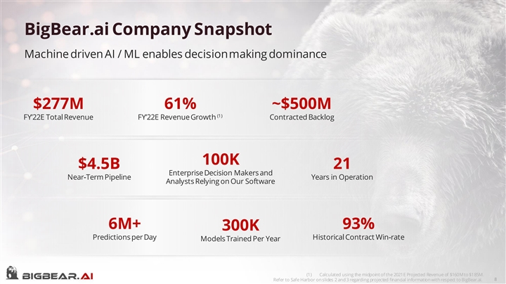 BigBear.ai Company Snapshot Machine driven AI / ML enables decision making dominance $277M 61% ~$500M (1) FY’22E Total Revenue FY’22E Revenue Growth Contracted Backlog 100K $4.5B 21 Enterprise Decision Makers and Near-Term Pipeline Years in Operation Analysts Relying on Our Software 6M+ 93% 300K Predictions per Day Historical Contract Win-rate Models Trained Per Year (1) Calculated using the midpoint of the 2021E Projected Revenue of $160M to $185M. Refer to Safe Harbor on slides 2 and 3 regarding projected financial information with respect to BigBear.ai. 8BigBear.ai Company Snapshot Machine driven AI / ML enables decision making dominance $277M 61% ~$500M (1) FY’22E Total Revenue FY’22E Revenue Growth Contracted Backlog 100K $4.5B 21 Enterprise Decision Makers and Near-Term Pipeline Years in Operation Analysts Relying on Our Software 6M+ 93% 300K Predictions per Day Historical Contract Win-rate Models Trained Per Year (1) Calculated using the midpoint of the 2021E Projected Revenue of $160M to $185M. Refer to Safe Harbor on slides 2 and 3 regarding projected financial information with respect to BigBear.ai. 8