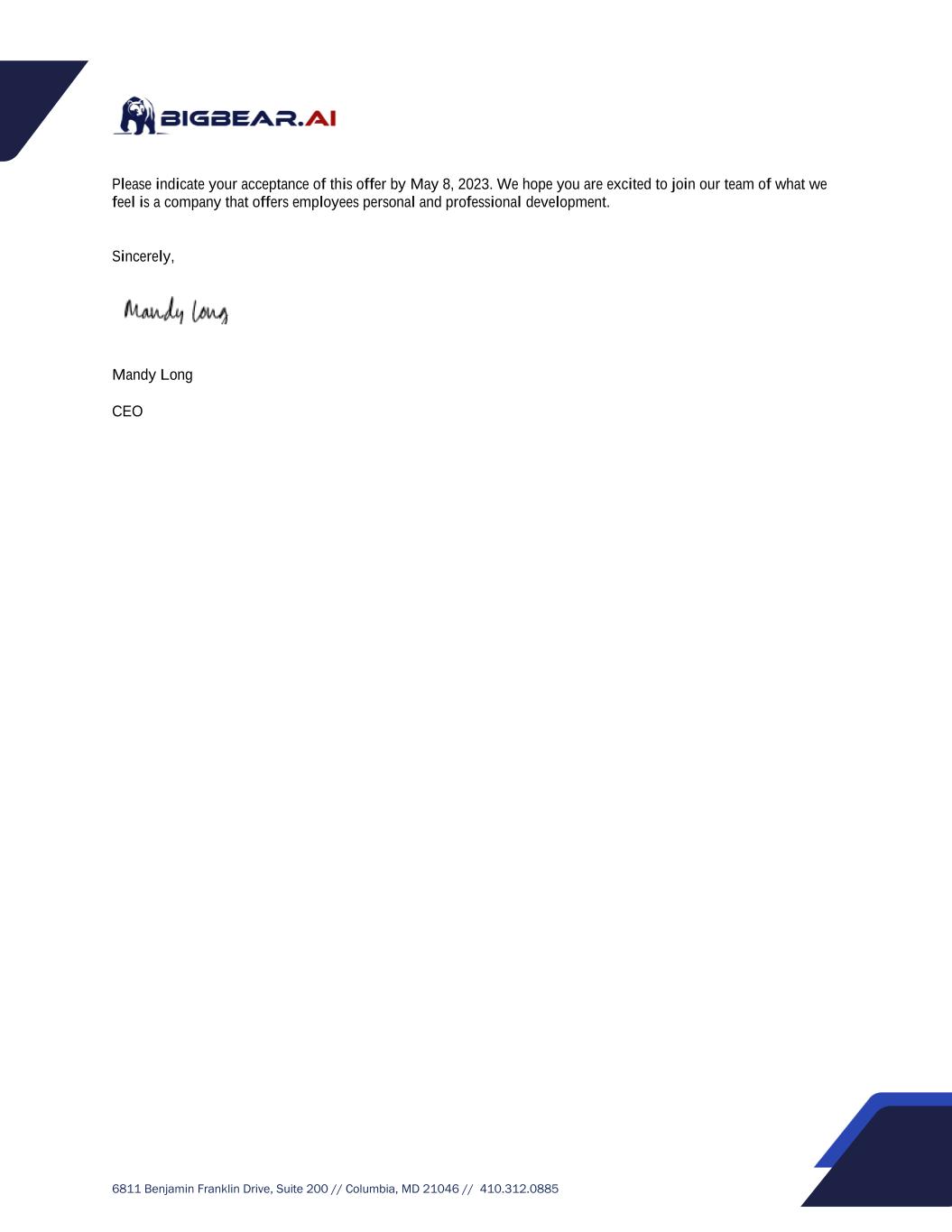 6811 Benjamin Franklin Drive, Suite 200 // Columbia, MD 21046 // 410.312.0885 Please indicate your acceptance of this offer by May 8, 2023. We hope you are excited to join our team of what we feel is a company that offers employees personal and professional development. Sincerely, Mandy Long CEO