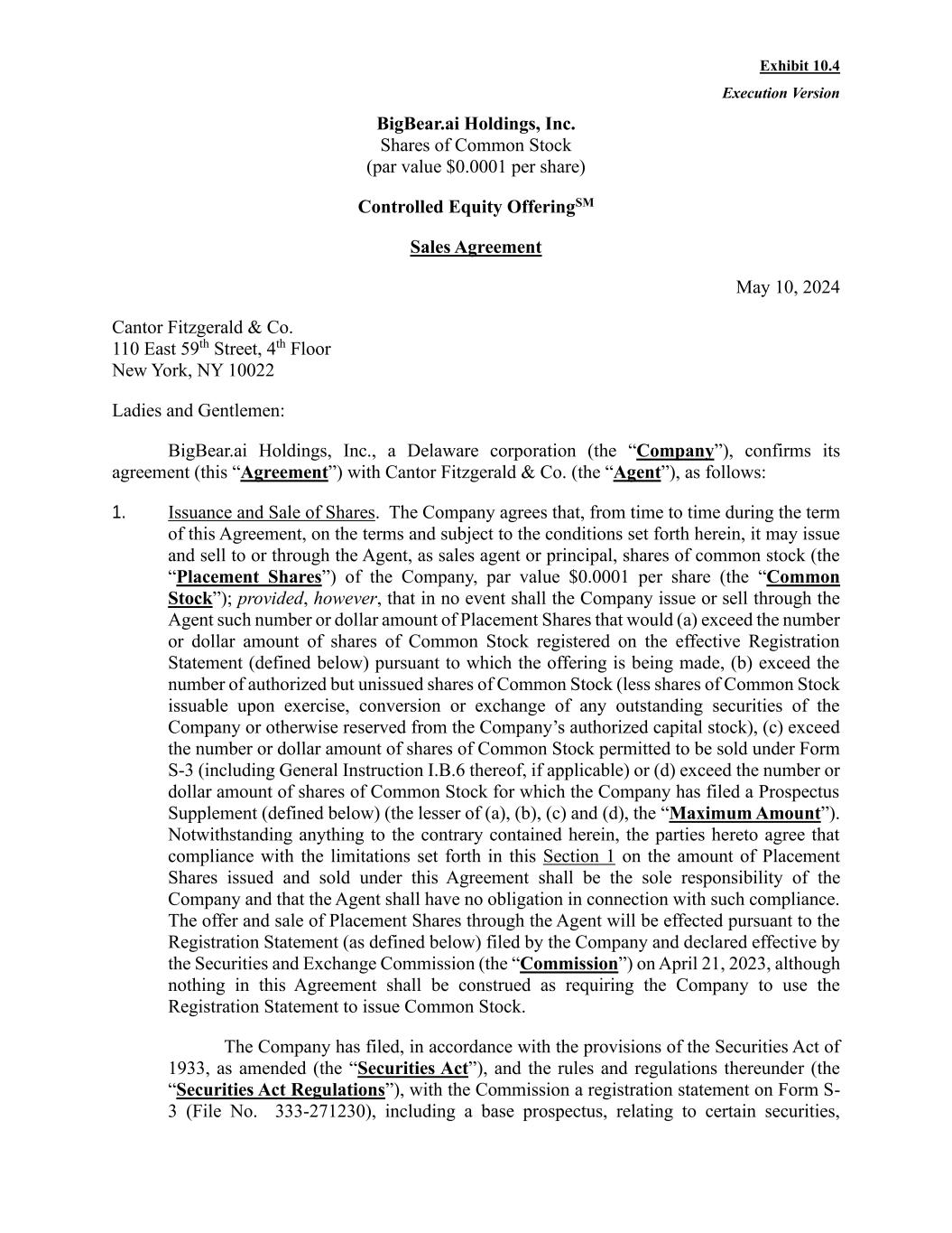 Exhibit 10.4 Execution Version BigBear.ai Holdings, Inc. Shares of Common Stock (par value $0.0001 per share) Controlled Equity OfferingSM Sales Agreement May 10, 2024 Cantor Fitzgerald & Co. 110 East 59th Street, 4th Floor New York, NY 10022 Ladies and Gentlemen: BigBear.ai Holdings, Inc., a Delaware corporation (the “Company”), confirms its agreement (this “Agreement”) with Cantor Fitzgerald & Co. (the “Agent”), as follows: 1. Issuance and Sale of Shares. The Company agrees that, from time to time during the term of this Agreement, on the terms and subject to the conditions set forth herein, it may issue and sell to or through the Agent, as sales agent or principal, shares of common stock (the “Placement Shares”) of the Company, par value $0.0001 per share (the “Common Stock”); provided, however, that in no event shall the Company issue or sell through the Agent such number or dollar amount of Placement Shares that would (a) exceed the number or dollar amount of shares of Common Stock registered on the effective Registration Statement (defined below) pursuant to which the offering is being made, (b) exceed the number of authorized but unissued shares of Common Stock (less shares of Common Stock issuable upon exercise, conversion or exchange of any outstanding securities of the Company or otherwise reserved from the Company’s authorized capital stock), (c) exceed the number or dollar amount of shares of Common Stock permitted to be sold under Form S-3 (including General Instruction I.B.6 thereof, if applicable) or (d) exceed the number or dollar amount of shares of Common Stock for which the Company has filed a Prospectus Supplement (defined below) (the lesser of (a), (b), (c) and (d), the “Maximum Amount”). Notwithstanding anything to the contrary contained herein, the parties hereto agree that compliance with the limitations set forth in this Section 1 on the amount of Placement Shares issued and sold under this Agreement shall be the sole responsibility of the Company and that the Agent shall have no obligation in connection with such compliance. The offer and sale of Placement Shares through the Agent will be effected pursuant to the Registration Statement (as defined below) filed by the Company and declared effective by the Securities and Exchange Commission (the “Commission”) on April 21, 2023, although nothing in this Agreement shall be construed as requiring the Company to use the Registration Statement to issue Common Stock. The Company has filed, in accordance with the provisions of the Securities Act of 1933, as amended (the “Securities Act”), and the rules and regulations thereunder (the “Securities Act Regulations”), with the Commission a registration statement on Form S- 3 (File No. 333-271230), including a base prospectus, relating to certain securities,