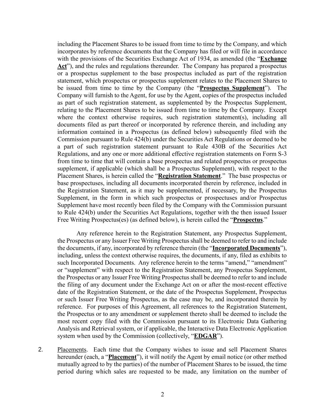 2 including the Placement Shares to be issued from time to time by the Company, and which incorporates by reference documents that the Company has filed or will file in accordance with the provisions of the Securities Exchange Act of 1934, as amended (the “Exchange Act”), and the rules and regulations thereunder. The Company has prepared a prospectus or a prospectus supplement to the base prospectus included as part of the registration statement, which prospectus or prospectus supplement relates to the Placement Shares to be issued from time to time by the Company (the “Prospectus Supplement”). The Company will furnish to the Agent, for use by the Agent, copies of the prospectus included as part of such registration statement, as supplemented by the Prospectus Supplement, relating to the Placement Shares to be issued from time to time by the Company. Except where the context otherwise requires, such registration statement(s), including all documents filed as part thereof or incorporated by reference therein, and including any information contained in a Prospectus (as defined below) subsequently filed with the Commission pursuant to Rule 424(b) under the Securities Act Regulations or deemed to be a part of such registration statement pursuant to Rule 430B of the Securities Act Regulations, and any one or more additional effective registration statements on Form S-3 from time to time that will contain a base prospectus and related prospectus or prospectus supplement, if applicable (which shall be a Prospectus Supplement), with respect to the Placement Shares, is herein called the “Registration Statement.” The base prospectus or base prospectuses, including all documents incorporated therein by reference, included in the Registration Statement, as it may be supplemented, if necessary, by the Prospectus Supplement, in the form in which such prospectus or prospectuses and/or Prospectus Supplement have most recently been filed by the Company with the Commission pursuant to Rule 424(b) under the Securities Act Regulations, together with the then issued Issuer Free Writing Prospectus(es) (as defined below), is herein called the “Prospectus.” Any reference herein to the Registration Statement, any Prospectus Supplement, the Prospectus or any Issuer Free Writing Prospectus shall be deemed to refer to and include the documents, if any, incorporated by reference therein (the “Incorporated Documents”), including, unless the context otherwise requires, the documents, if any, filed as exhibits to such Incorporated Documents. Any reference herein to the terms “amend,” “amendment” or “supplement” with respect to the Registration Statement, any Prospectus Supplement, the Prospectus or any Issuer Free Writing Prospectus shall be deemed to refer to and include the filing of any document under the Exchange Act on or after the most-recent effective date of the Registration Statement, or the date of the Prospectus Supplement, Prospectus or such Issuer Free Writing Prospectus, as the case may be, and incorporated therein by reference. For purposes of this Agreement, all references to the Registration Statement, the Prospectus or to any amendment or supplement thereto shall be deemed to include the most recent copy filed with the Commission pursuant to its Electronic Data Gathering Analysis and Retrieval system, or if applicable, the Interactive Data Electronic Application system when used by the Commission (collectively, “EDGAR”). 2. Placements. Each time that the Company wishes to issue and sell Placement Shares hereunder (each, a “Placement”), it will notify the Agent by email notice (or other method mutually agreed to by the parties) of the number of Placement Shares to be issued, the time period during which sales are requested to be made, any limitation on the number of