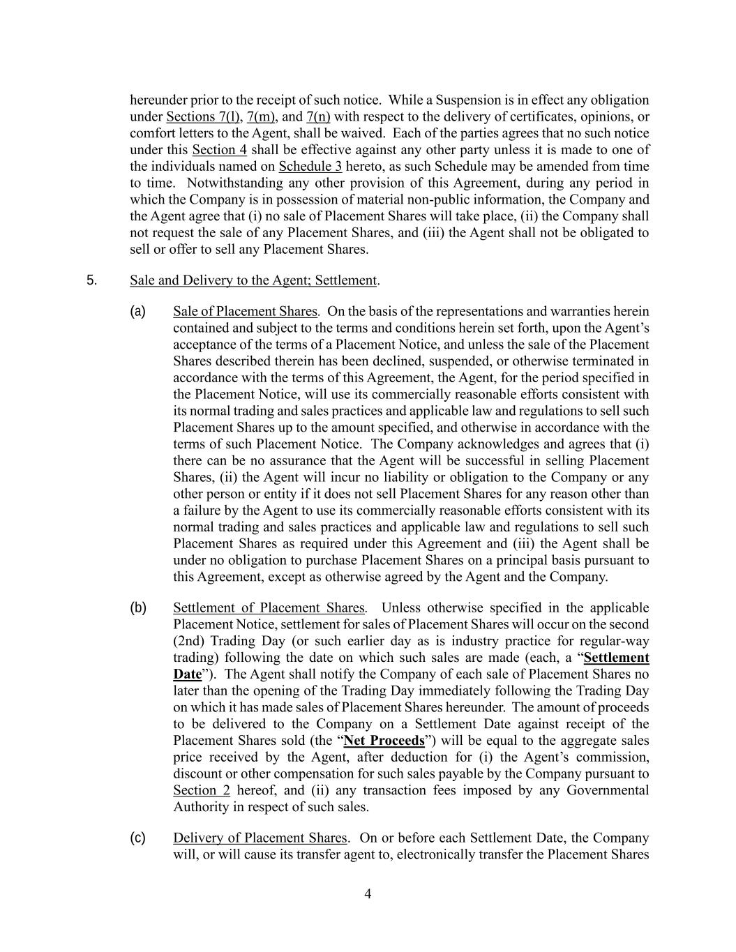 4 hereunder prior to the receipt of such notice. While a Suspension is in effect any obligation under Sections 7(l), 7(m), and 7(n) with respect to the delivery of certificates, opinions, or comfort letters to the Agent, shall be waived. Each of the parties agrees that no such notice under this Section 4 shall be effective against any other party unless it is made to one of the individuals named on Schedule 3 hereto, as such Schedule may be amended from time to time. Notwithstanding any other provision of this Agreement, during any period in which the Company is in possession of material non-public information, the Company and the Agent agree that (i) no sale of Placement Shares will take place, (ii) the Company shall not request the sale of any Placement Shares, and (iii) the Agent shall not be obligated to sell or offer to sell any Placement Shares. 5. Sale and Delivery to the Agent; Settlement. (a) Sale of Placement Shares. On the basis of the representations and warranties herein contained and subject to the terms and conditions herein set forth, upon the Agent’s acceptance of the terms of a Placement Notice, and unless the sale of the Placement Shares described therein has been declined, suspended, or otherwise terminated in accordance with the terms of this Agreement, the Agent, for the period specified in the Placement Notice, will use its commercially reasonable efforts consistent with its normal trading and sales practices and applicable law and regulations to sell such Placement Shares up to the amount specified, and otherwise in accordance with the terms of such Placement Notice. The Company acknowledges and agrees that (i) there can be no assurance that the Agent will be successful in selling Placement Shares, (ii) the Agent will incur no liability or obligation to the Company or any other person or entity if it does not sell Placement Shares for any reason other than a failure by the Agent to use its commercially reasonable efforts consistent with its normal trading and sales practices and applicable law and regulations to sell such Placement Shares as required under this Agreement and (iii) the Agent shall be under no obligation to purchase Placement Shares on a principal basis pursuant to this Agreement, except as otherwise agreed by the Agent and the Company. (b) Settlement of Placement Shares. Unless otherwise specified in the applicable Placement Notice, settlement for sales of Placement Shares will occur on the second (2nd) Trading Day (or such earlier day as is industry practice for regular-way trading) following the date on which such sales are made (each, a “Settlement Date”). The Agent shall notify the Company of each sale of Placement Shares no later than the opening of the Trading Day immediately following the Trading Day on which it has made sales of Placement Shares hereunder. The amount of proceeds to be delivered to the Company on a Settlement Date against receipt of the Placement Shares sold (the “Net Proceeds”) will be equal to the aggregate sales price received by the Agent, after deduction for (i) the Agent’s commission, discount or other compensation for such sales payable by the Company pursuant to Section 2 hereof, and (ii) any transaction fees imposed by any Governmental Authority in respect of such sales. (c) Delivery of Placement Shares. On or before each Settlement Date, the Company will, or will cause its transfer agent to, electronically transfer the Placement Shares