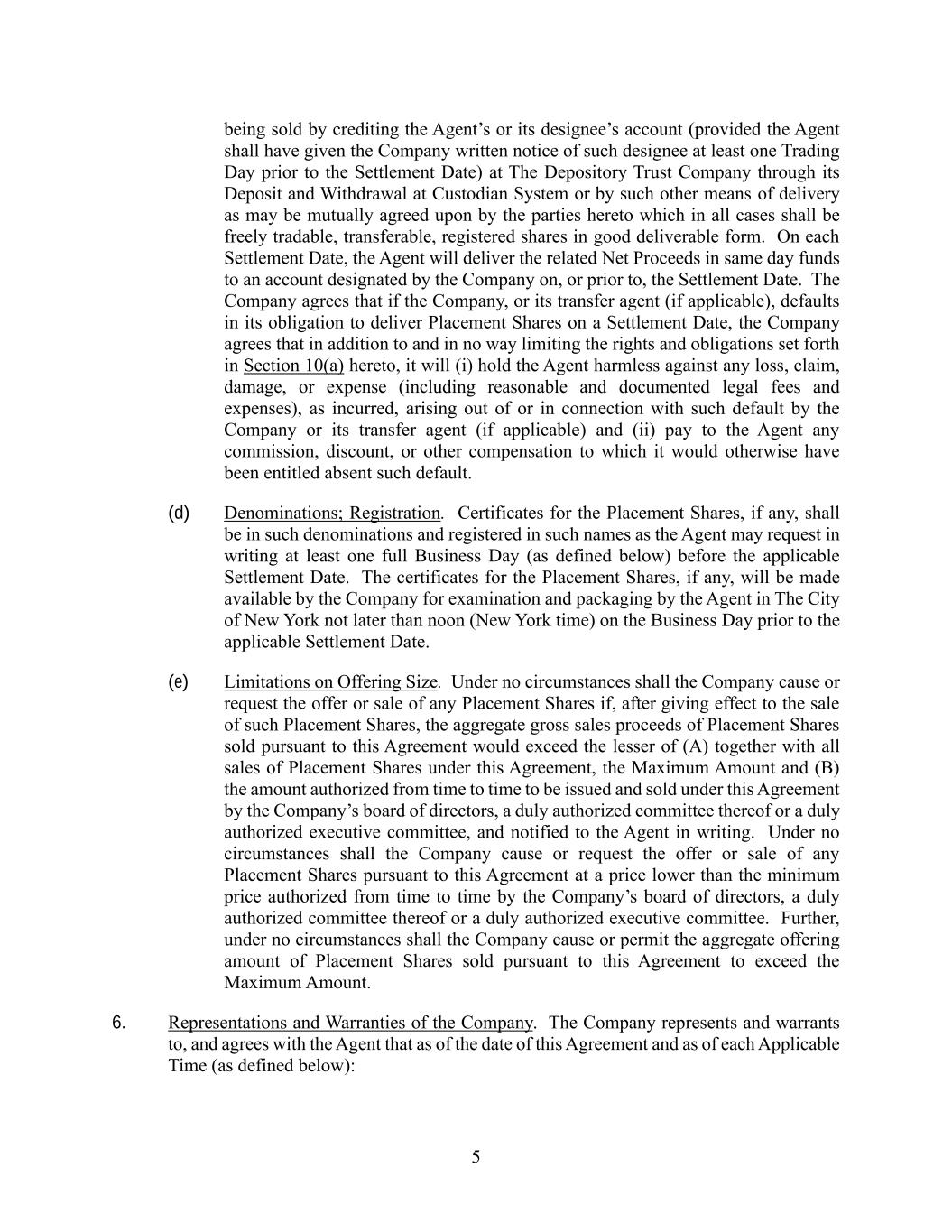 5 being sold by crediting the Agent’s or its designee’s account (provided the Agent shall have given the Company written notice of such designee at least one Trading Day prior to the Settlement Date) at The Depository Trust Company through its Deposit and Withdrawal at Custodian System or by such other means of delivery as may be mutually agreed upon by the parties hereto which in all cases shall be freely tradable, transferable, registered shares in good deliverable form. On each Settlement Date, the Agent will deliver the related Net Proceeds in same day funds to an account designated by the Company on, or prior to, the Settlement Date. The Company agrees that if the Company, or its transfer agent (if applicable), defaults in its obligation to deliver Placement Shares on a Settlement Date, the Company agrees that in addition to and in no way limiting the rights and obligations set forth in Section 10(a) hereto, it will (i) hold the Agent harmless against any loss, claim, damage, or expense (including reasonable and documented legal fees and expenses), as incurred, arising out of or in connection with such default by the Company or its transfer agent (if applicable) and (ii) pay to the Agent any commission, discount, or other compensation to which it would otherwise have been entitled absent such default. (d) Denominations; Registration. Certificates for the Placement Shares, if any, shall be in such denominations and registered in such names as the Agent may request in writing at least one full Business Day (as defined below) before the applicable Settlement Date. The certificates for the Placement Shares, if any, will be made available by the Company for examination and packaging by the Agent in The City of New York not later than noon (New York time) on the Business Day prior to the applicable Settlement Date. (e) Limitations on Offering Size. Under no circumstances shall the Company cause or request the offer or sale of any Placement Shares if, after giving effect to the sale of such Placement Shares, the aggregate gross sales proceeds of Placement Shares sold pursuant to this Agreement would exceed the lesser of (A) together with all sales of Placement Shares under this Agreement, the Maximum Amount and (B) the amount authorized from time to time to be issued and sold under this Agreement by the Company’s board of directors, a duly authorized committee thereof or a duly authorized executive committee, and notified to the Agent in writing. Under no circumstances shall the Company cause or request the offer or sale of any Placement Shares pursuant to this Agreement at a price lower than the minimum price authorized from time to time by the Company’s board of directors, a duly authorized committee thereof or a duly authorized executive committee. Further, under no circumstances shall the Company cause or permit the aggregate offering amount of Placement Shares sold pursuant to this Agreement to exceed the Maximum Amount. 6. Representations and Warranties of the Company. The Company represents and warrants to, and agrees with the Agent that as of the date of this Agreement and as of each Applicable Time (as defined below):