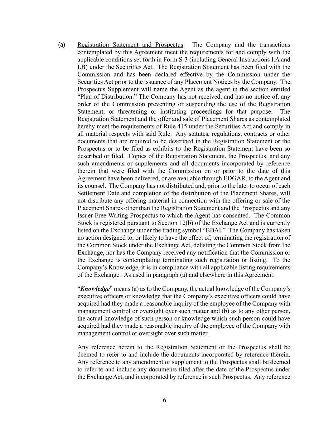 6 (a) Registration Statement and Prospectus. The Company and the transactions contemplated by this Agreement meet the requirements for and comply with the applicable conditions set forth in Form S-3 (including General Instructions I.A and I.B) under the Securities Act. The Registration Statement has been filed with the Commission and has been declared effective by the Commission under the Securities Act prior to the issuance of any Placement Notices by the Company. The Prospectus Supplement will name the Agent as the agent in the section entitled “Plan of Distribution.” The Company has not received, and has no notice of, any order of the Commission preventing or suspending the use of the Registration Statement, or threatening or instituting proceedings for that purpose. The Registration Statement and the offer and sale of Placement Shares as contemplated hereby meet the requirements of Rule 415 under the Securities Act and comply in all material respects with said Rule. Any statutes, regulations, contracts or other documents that are required to be described in the Registration Statement or the Prospectus or to be filed as exhibits to the Registration Statement have been so described or filed. Copies of the Registration Statement, the Prospectus, and any such amendments or supplements and all documents incorporated by reference therein that were filed with the Commission on or prior to the date of this Agreement have been delivered, or are available through EDGAR, to the Agent and its counsel. The Company has not distributed and, prior to the later to occur of each Settlement Date and completion of the distribution of the Placement Shares, will not distribute any offering material in connection with the offering or sale of the Placement Shares other than the Registration Statement and the Prospectus and any Issuer Free Writing Prospectus to which the Agent has consented. The Common Stock is registered pursuant to Section 12(b) of the Exchange Act and is currently listed on the Exchange under the trading symbol “BBAI.” The Company has taken no action designed to, or likely to have the effect of, terminating the registration of the Common Stock under the Exchange Act, delisting the Common Stock from the Exchange, nor has the Company received any notification that the Commission or the Exchange is contemplating terminating such registration or listing. To the Company’s Knowledge, it is in compliance with all applicable listing requirements of the Exchange. As used in paragraph (a) and elsewhere in this Agreement: “Knowledge” means (a) as to the Company, the actual knowledge of the Company’s executive officers or knowledge that the Company’s executive officers could have acquired had they made a reasonable inquiry of the employee of the Company with management control or oversight over such matter and (b) as to any other person, the actual knowledge of such person or knowledge which such person could have acquired had they made a reasonable inquiry of the employee of the Company with management control or oversight over such matter. Any reference herein to the Registration Statement or the Prospectus shall be deemed to refer to and include the documents incorporated by reference therein. Any reference to any amendment or supplement to the Prospectus shall be deemed to refer to and include any documents filed after the date of the Prospectus under the Exchange Act, and incorporated by reference in such Prospectus. Any reference