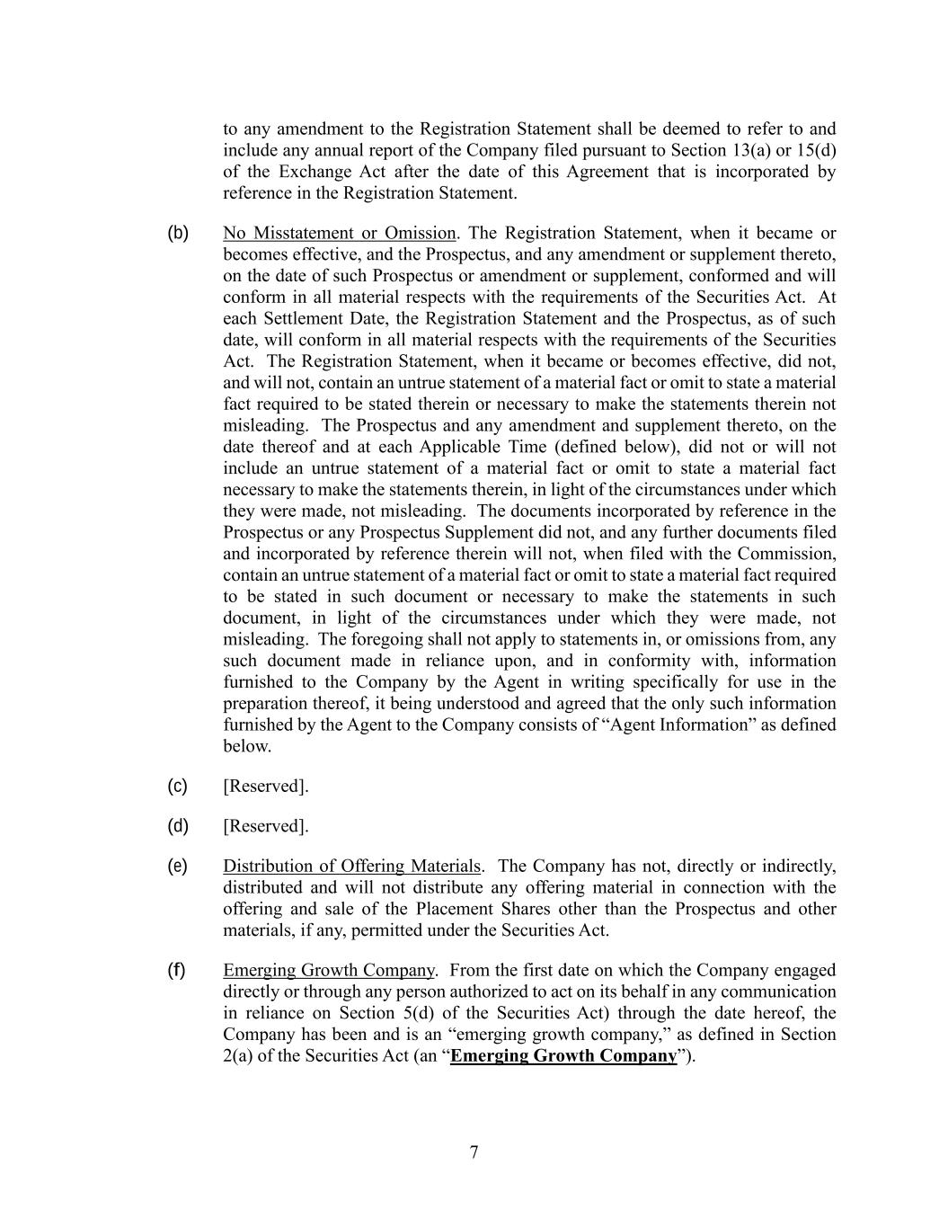 7 to any amendment to the Registration Statement shall be deemed to refer to and include any annual report of the Company filed pursuant to Section 13(a) or 15(d) of the Exchange Act after the date of this Agreement that is incorporated by reference in the Registration Statement. (b) No Misstatement or Omission. The Registration Statement, when it became or becomes effective, and the Prospectus, and any amendment or supplement thereto, on the date of such Prospectus or amendment or supplement, conformed and will conform in all material respects with the requirements of the Securities Act. At each Settlement Date, the Registration Statement and the Prospectus, as of such date, will conform in all material respects with the requirements of the Securities Act. The Registration Statement, when it became or becomes effective, did not, and will not, contain an untrue statement of a material fact or omit to state a material fact required to be stated therein or necessary to make the statements therein not misleading. The Prospectus and any amendment and supplement thereto, on the date thereof and at each Applicable Time (defined below), did not or will not include an untrue statement of a material fact or omit to state a material fact necessary to make the statements therein, in light of the circumstances under which they were made, not misleading. The documents incorporated by reference in the Prospectus or any Prospectus Supplement did not, and any further documents filed and incorporated by reference therein will not, when filed with the Commission, contain an untrue statement of a material fact or omit to state a material fact required to be stated in such document or necessary to make the statements in such document, in light of the circumstances under which they were made, not misleading. The foregoing shall not apply to statements in, or omissions from, any such document made in reliance upon, and in conformity with, information furnished to the Company by the Agent in writing specifically for use in the preparation thereof, it being understood and agreed that the only such information furnished by the Agent to the Company consists of “Agent Information” as defined below. (c) [Reserved]. (d) [Reserved]. (e) Distribution of Offering Materials. The Company has not, directly or indirectly, distributed and will not distribute any offering material in connection with the offering and sale of the Placement Shares other than the Prospectus and other materials, if any, permitted under the Securities Act. (f) Emerging Growth Company. From the first date on which the Company engaged directly or through any person authorized to act on its behalf in any communication in reliance on Section 5(d) of the Securities Act) through the date hereof, the Company has been and is an “emerging growth company,” as defined in Section 2(a) of the Securities Act (an “Emerging Growth Company”).