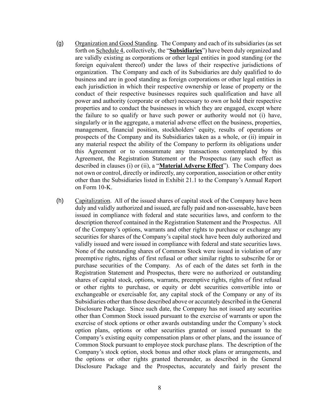 8 (g) Organization and Good Standing. The Company and each of its subsidiaries (as set forth on Schedule 4, collectively, the “Subsidiaries”) have been duly organized and are validly existing as corporations or other legal entities in good standing (or the foreign equivalent thereof) under the laws of their respective jurisdictions of organization. The Company and each of its Subsidiaries are duly qualified to do business and are in good standing as foreign corporations or other legal entities in each jurisdiction in which their respective ownership or lease of property or the conduct of their respective businesses requires such qualification and have all power and authority (corporate or other) necessary to own or hold their respective properties and to conduct the businesses in which they are engaged, except where the failure to so qualify or have such power or authority would not (i) have, singularly or in the aggregate, a material adverse effect on the business, properties, management, financial position, stockholders’ equity, results of operations or prospects of the Company and its Subsidiaries taken as a whole, or (ii) impair in any material respect the ability of the Company to perform its obligations under this Agreement or to consummate any transactions contemplated by this Agreement, the Registration Statement or the Prospectus (any such effect as described in clauses (i) or (ii), a “Material Adverse Effect”). The Company does not own or control, directly or indirectly, any corporation, association or other entity other than the Subsidiaries listed in Exhibit 21.1 to the Company’s Annual Report on Form 10-K. (h) Capitalization. All of the issued shares of capital stock of the Company have been duly and validly authorized and issued, are fully paid and non-assessable, have been issued in compliance with federal and state securities laws, and conform to the description thereof contained in the Registration Statement and the Prospectus. All of the Company’s options, warrants and other rights to purchase or exchange any securities for shares of the Company’s capital stock have been duly authorized and validly issued and were issued in compliance with federal and state securities laws. None of the outstanding shares of Common Stock were issued in violation of any preemptive rights, rights of first refusal or other similar rights to subscribe for or purchase securities of the Company. As of each of the dates set forth in the Registration Statement and Prospectus, there were no authorized or outstanding shares of capital stock, options, warrants, preemptive rights, rights of first refusal or other rights to purchase, or equity or debt securities convertible into or exchangeable or exercisable for, any capital stock of the Company or any of its Subsidiaries other than those described above or accurately described in the General Disclosure Package. Since such date, the Company has not issued any securities other than Common Stock issued pursuant to the exercise of warrants or upon the exercise of stock options or other awards outstanding under the Company’s stock option plans, options or other securities granted or issued pursuant to the Company’s existing equity compensation plans or other plans, and the issuance of Common Stock pursuant to employee stock purchase plans. The description of the Company’s stock option, stock bonus and other stock plans or arrangements, and the options or other rights granted thereunder, as described in the General Disclosure Package and the Prospectus, accurately and fairly present the