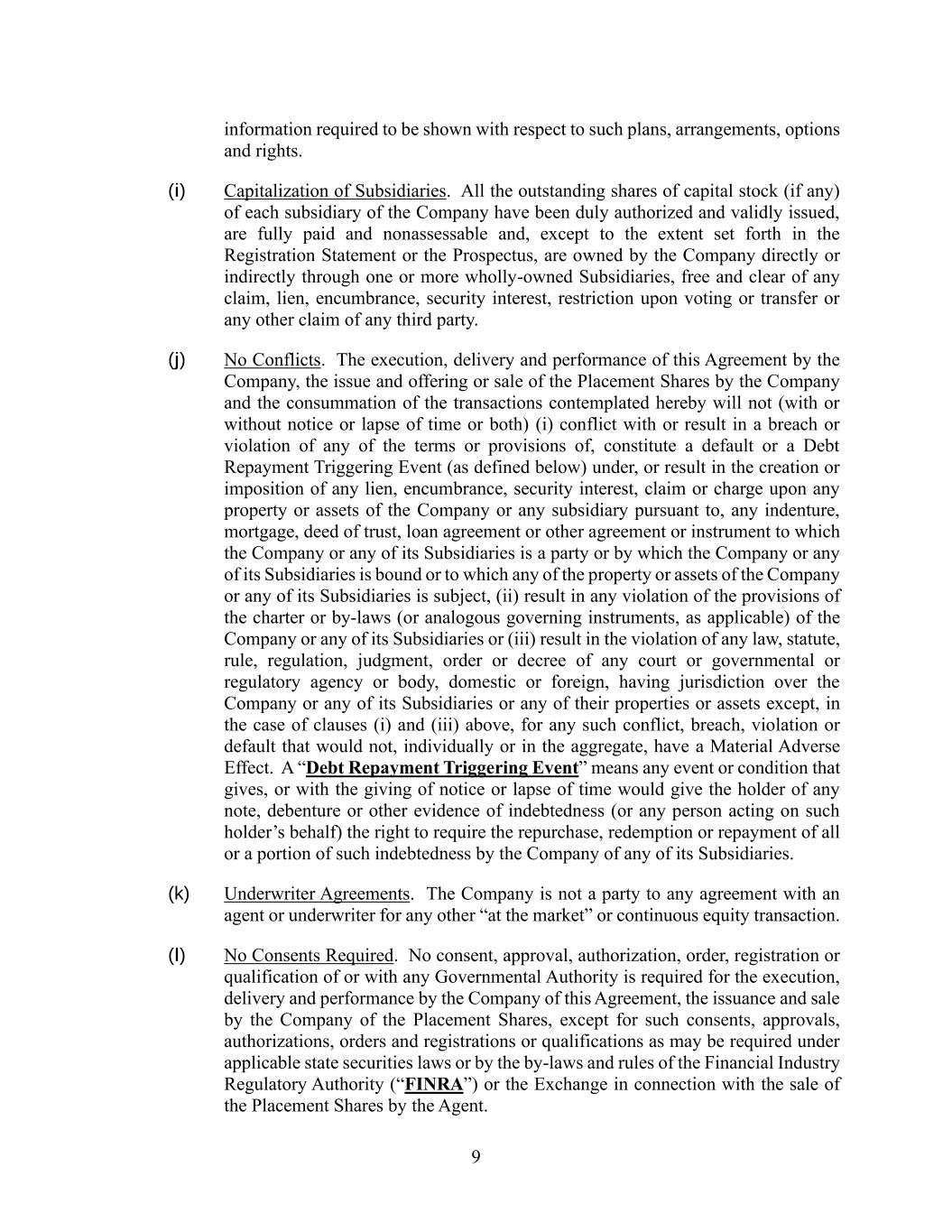 9 information required to be shown with respect to such plans, arrangements, options and rights. (i) Capitalization of Subsidiaries. All the outstanding shares of capital stock (if any) of each subsidiary of the Company have been duly authorized and validly issued, are fully paid and nonassessable and, except to the extent set forth in the Registration Statement or the Prospectus, are owned by the Company directly or indirectly through one or more wholly-owned Subsidiaries, free and clear of any claim, lien, encumbrance, security interest, restriction upon voting or transfer or any other claim of any third party. (j) No Conflicts. The execution, delivery and performance of this Agreement by the Company, the issue and offering or sale of the Placement Shares by the Company and the consummation of the transactions contemplated hereby will not (with or without notice or lapse of time or both) (i) conflict with or result in a breach or violation of any of the terms or provisions of, constitute a default or a Debt Repayment Triggering Event (as defined below) under, or result in the creation or imposition of any lien, encumbrance, security interest, claim or charge upon any property or assets of the Company or any subsidiary pursuant to, any indenture, mortgage, deed of trust, loan agreement or other agreement or instrument to which the Company or any of its Subsidiaries is a party or by which the Company or any of its Subsidiaries is bound or to which any of the property or assets of the Company or any of its Subsidiaries is subject, (ii) result in any violation of the provisions of the charter or by-laws (or analogous governing instruments, as applicable) of the Company or any of its Subsidiaries or (iii) result in the violation of any law, statute, rule, regulation, judgment, order or decree of any court or governmental or regulatory agency or body, domestic or foreign, having jurisdiction over the Company or any of its Subsidiaries or any of their properties or assets except, in the case of clauses (i) and (iii) above, for any such conflict, breach, violation or default that would not, individually or in the aggregate, have a Material Adverse Effect. A “Debt Repayment Triggering Event” means any event or condition that gives, or with the giving of notice or lapse of time would give the holder of any note, debenture or other evidence of indebtedness (or any person acting on such holder’s behalf) the right to require the repurchase, redemption or repayment of all or a portion of such indebtedness by the Company of any of its Subsidiaries. (k) Underwriter Agreements. The Company is not a party to any agreement with an agent or underwriter for any other “at the market” or continuous equity transaction. (l) No Consents Required. No consent, approval, authorization, order, registration or qualification of or with any Governmental Authority is required for the execution, delivery and performance by the Company of this Agreement, the issuance and sale by the Company of the Placement Shares, except for such consents, approvals, authorizations, orders and registrations or qualifications as may be required under applicable state securities laws or by the by-laws and rules of the Financial Industry Regulatory Authority (“FINRA”) or the Exchange in connection with the sale of the Placement Shares by the Agent.