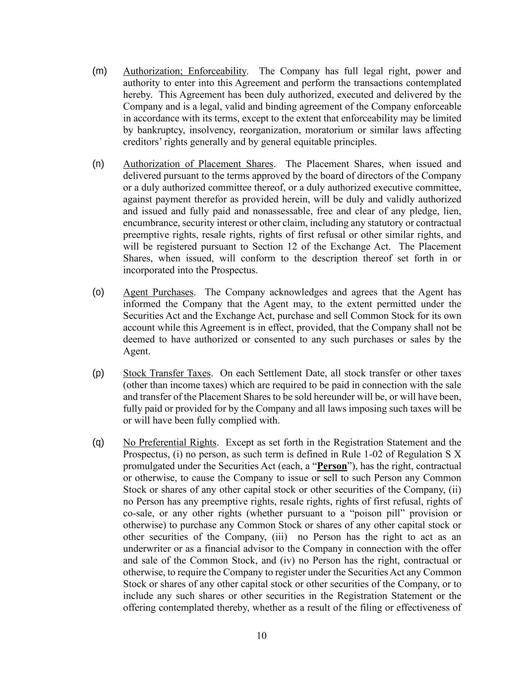 10 (m) Authorization; Enforceability. The Company has full legal right, power and authority to enter into this Agreement and perform the transactions contemplated hereby. This Agreement has been duly authorized, executed and delivered by the Company and is a legal, valid and binding agreement of the Company enforceable in accordance with its terms, except to the extent that enforceability may be limited by bankruptcy, insolvency, reorganization, moratorium or similar laws affecting creditors’ rights generally and by general equitable principles. (n) Authorization of Placement Shares. The Placement Shares, when issued and delivered pursuant to the terms approved by the board of directors of the Company or a duly authorized committee thereof, or a duly authorized executive committee, against payment therefor as provided herein, will be duly and validly authorized and issued and fully paid and nonassessable, free and clear of any pledge, lien, encumbrance, security interest or other claim, including any statutory or contractual preemptive rights, resale rights, rights of first refusal or other similar rights, and will be registered pursuant to Section 12 of the Exchange Act. The Placement Shares, when issued, will conform to the description thereof set forth in or incorporated into the Prospectus. (o) Agent Purchases. The Company acknowledges and agrees that the Agent has informed the Company that the Agent may, to the extent permitted under the Securities Act and the Exchange Act, purchase and sell Common Stock for its own account while this Agreement is in effect, provided, that the Company shall not be deemed to have authorized or consented to any such purchases or sales by the Agent. (p) Stock Transfer Taxes. On each Settlement Date, all stock transfer or other taxes (other than income taxes) which are required to be paid in connection with the sale and transfer of the Placement Shares to be sold hereunder will be, or will have been, fully paid or provided for by the Company and all laws imposing such taxes will be or will have been fully complied with. (q) No Preferential Rights. Except as set forth in the Registration Statement and the Prospectus, (i) no person, as such term is defined in Rule 1-02 of Regulation S X promulgated under the Securities Act (each, a “Person”), has the right, contractual or otherwise, to cause the Company to issue or sell to such Person any Common Stock or shares of any other capital stock or other securities of the Company, (ii) no Person has any preemptive rights, resale rights, rights of first refusal, rights of co-sale, or any other rights (whether pursuant to a “poison pill” provision or otherwise) to purchase any Common Stock or shares of any other capital stock or other securities of the Company, (iii) no Person has the right to act as an underwriter or as a financial advisor to the Company in connection with the offer and sale of the Common Stock, and (iv) no Person has the right, contractual or otherwise, to require the Company to register under the Securities Act any Common Stock or shares of any other capital stock or other securities of the Company, or to include any such shares or other securities in the Registration Statement or the offering contemplated thereby, whether as a result of the filing or effectiveness of