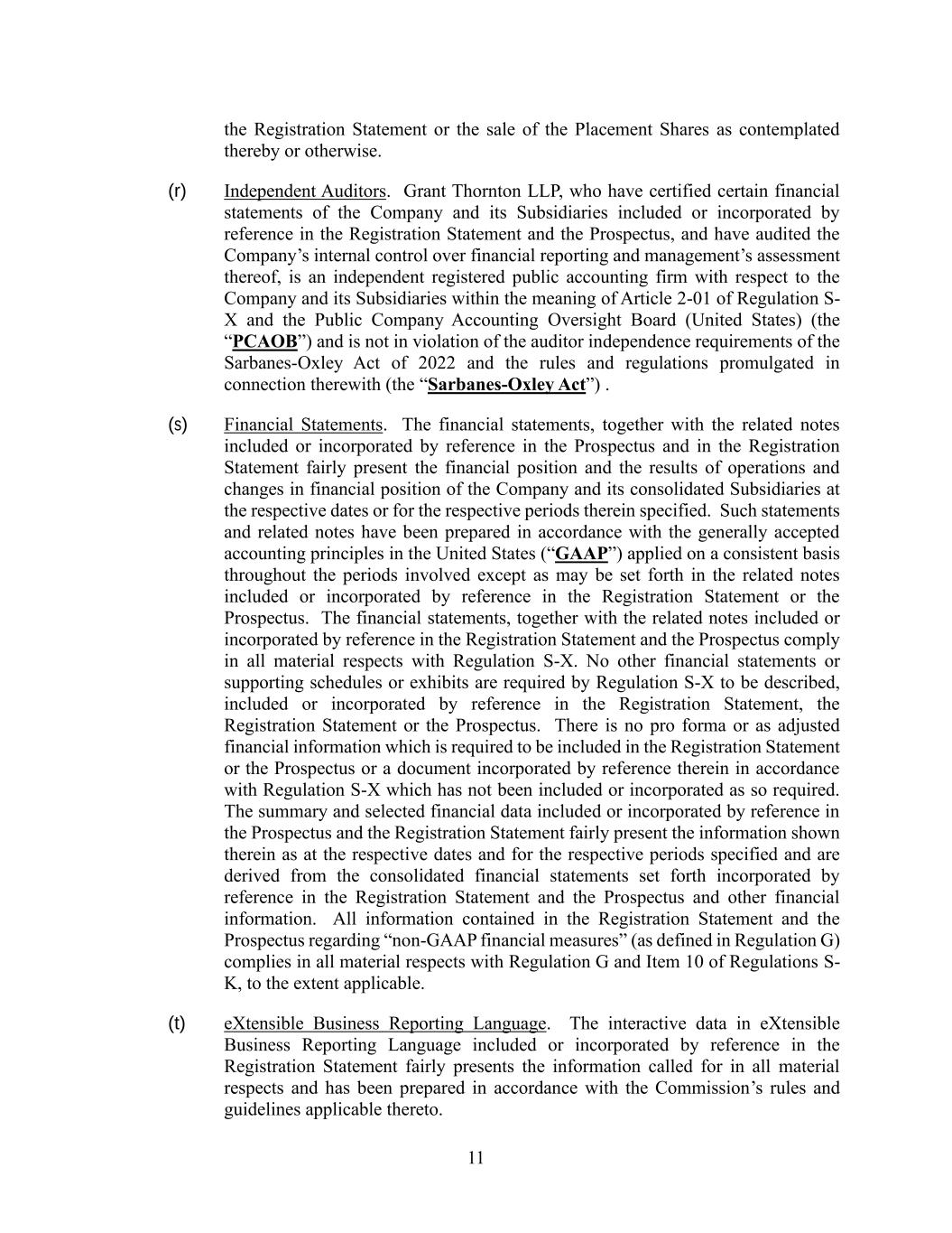 11 the Registration Statement or the sale of the Placement Shares as contemplated thereby or otherwise. (r) Independent Auditors. Grant Thornton LLP, who have certified certain financial statements of the Company and its Subsidiaries included or incorporated by reference in the Registration Statement and the Prospectus, and have audited the Company’s internal control over financial reporting and management’s assessment thereof, is an independent registered public accounting firm with respect to the Company and its Subsidiaries within the meaning of Article 2-01 of Regulation S- X and the Public Company Accounting Oversight Board (United States) (the “PCAOB”) and is not in violation of the auditor independence requirements of the Sarbanes-Oxley Act of 2022 and the rules and regulations promulgated in connection therewith (the “Sarbanes-Oxley Act”) . (s) Financial Statements. The financial statements, together with the related notes included or incorporated by reference in the Prospectus and in the Registration Statement fairly present the financial position and the results of operations and changes in financial position of the Company and its consolidated Subsidiaries at the respective dates or for the respective periods therein specified. Such statements and related notes have been prepared in accordance with the generally accepted accounting principles in the United States (“GAAP”) applied on a consistent basis throughout the periods involved except as may be set forth in the related notes included or incorporated by reference in the Registration Statement or the Prospectus. The financial statements, together with the related notes included or incorporated by reference in the Registration Statement and the Prospectus comply in all material respects with Regulation S-X. No other financial statements or supporting schedules or exhibits are required by Regulation S-X to be described, included or incorporated by reference in the Registration Statement, the Registration Statement or the Prospectus. There is no pro forma or as adjusted financial information which is required to be included in the Registration Statement or the Prospectus or a document incorporated by reference therein in accordance with Regulation S-X which has not been included or incorporated as so required. The summary and selected financial data included or incorporated by reference in the Prospectus and the Registration Statement fairly present the information shown therein as at the respective dates and for the respective periods specified and are derived from the consolidated financial statements set forth incorporated by reference in the Registration Statement and the Prospectus and other financial information. All information contained in the Registration Statement and the Prospectus regarding “non-GAAP financial measures” (as defined in Regulation G) complies in all material respects with Regulation G and Item 10 of Regulations S- K, to the extent applicable. (t) eXtensible Business Reporting Language. The interactive data in eXtensible Business Reporting Language included or incorporated by reference in the Registration Statement fairly presents the information called for in all material respects and has been prepared in accordance with the Commission’s rules and guidelines applicable thereto.