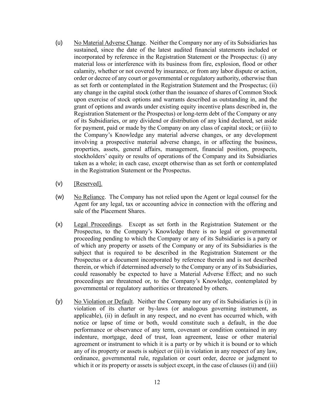 12 (u) No Material Adverse Change. Neither the Company nor any of its Subsidiaries has sustained, since the date of the latest audited financial statements included or incorporated by reference in the Registration Statement or the Prospectus: (i) any material loss or interference with its business from fire, explosion, flood or other calamity, whether or not covered by insurance, or from any labor dispute or action, order or decree of any court or governmental or regulatory authority, otherwise than as set forth or contemplated in the Registration Statement and the Prospectus; (ii) any change in the capital stock (other than the issuance of shares of Common Stock upon exercise of stock options and warrants described as outstanding in, and the grant of options and awards under existing equity incentive plans described in, the Registration Statement or the Prospectus) or long-term debt of the Company or any of its Subsidiaries, or any dividend or distribution of any kind declared, set aside for payment, paid or made by the Company on any class of capital stock; or (iii) to the Company’s Knowledge any material adverse changes, or any development involving a prospective material adverse change, in or affecting the business, properties, assets, general affairs, management, financial position, prospects, stockholders’ equity or results of operations of the Company and its Subsidiaries taken as a whole; in each case, except otherwise than as set forth or contemplated in the Registration Statement or the Prospectus. (v) [Reserved]. (w) No Reliance. The Company has not relied upon the Agent or legal counsel for the Agent for any legal, tax or accounting advice in connection with the offering and sale of the Placement Shares. (x) Legal Proceedings. Except as set forth in the Registration Statement or the Prospectus, to the Company’s Knowledge there is no legal or governmental proceeding pending to which the Company or any of its Subsidiaries is a party or of which any property or assets of the Company or any of its Subsidiaries is the subject that is required to be described in the Registration Statement or the Prospectus or a document incorporated by reference therein and is not described therein, or which if determined adversely to the Company or any of its Subsidiaries, could reasonably be expected to have a Material Adverse Effect; and no such proceedings are threatened or, to the Company’s Knowledge, contemplated by governmental or regulatory authorities or threatened by others. (y) No Violation or Default. Neither the Company nor any of its Subsidiaries is (i) in violation of its charter or by-laws (or analogous governing instrument, as applicable), (ii) in default in any respect, and no event has occurred which, with notice or lapse of time or both, would constitute such a default, in the due performance or observance of any term, covenant or condition contained in any indenture, mortgage, deed of trust, loan agreement, lease or other material agreement or instrument to which it is a party or by which it is bound or to which any of its property or assets is subject or (iii) in violation in any respect of any law, ordinance, governmental rule, regulation or court order, decree or judgment to which it or its property or assets is subject except, in the case of clauses (ii) and (iii)