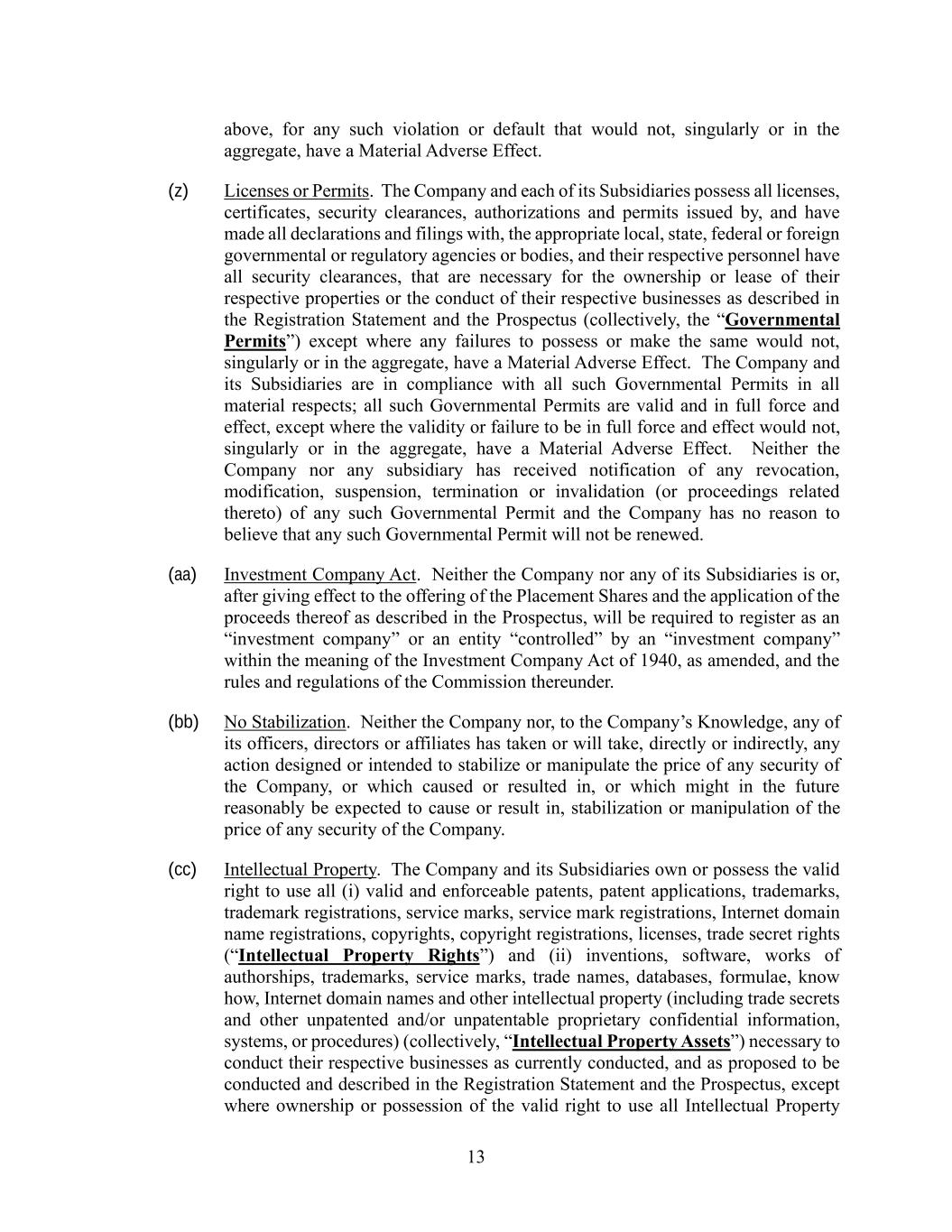 13 above, for any such violation or default that would not, singularly or in the aggregate, have a Material Adverse Effect. (z) Licenses or Permits. The Company and each of its Subsidiaries possess all licenses, certificates, security clearances, authorizations and permits issued by, and have made all declarations and filings with, the appropriate local, state, federal or foreign governmental or regulatory agencies or bodies, and their respective personnel have all security clearances, that are necessary for the ownership or lease of their respective properties or the conduct of their respective businesses as described in the Registration Statement and the Prospectus (collectively, the “Governmental Permits”) except where any failures to possess or make the same would not, singularly or in the aggregate, have a Material Adverse Effect. The Company and its Subsidiaries are in compliance with all such Governmental Permits in all material respects; all such Governmental Permits are valid and in full force and effect, except where the validity or failure to be in full force and effect would not, singularly or in the aggregate, have a Material Adverse Effect. Neither the Company nor any subsidiary has received notification of any revocation, modification, suspension, termination or invalidation (or proceedings related thereto) of any such Governmental Permit and the Company has no reason to believe that any such Governmental Permit will not be renewed. (aa) Investment Company Act. Neither the Company nor any of its Subsidiaries is or, after giving effect to the offering of the Placement Shares and the application of the proceeds thereof as described in the Prospectus, will be required to register as an “investment company” or an entity “controlled” by an “investment company” within the meaning of the Investment Company Act of 1940, as amended, and the rules and regulations of the Commission thereunder. (bb) No Stabilization. Neither the Company nor, to the Company’s Knowledge, any of its officers, directors or affiliates has taken or will take, directly or indirectly, any action designed or intended to stabilize or manipulate the price of any security of the Company, or which caused or resulted in, or which might in the future reasonably be expected to cause or result in, stabilization or manipulation of the price of any security of the Company. (cc) Intellectual Property. The Company and its Subsidiaries own or possess the valid right to use all (i) valid and enforceable patents, patent applications, trademarks, trademark registrations, service marks, service mark registrations, Internet domain name registrations, copyrights, copyright registrations, licenses, trade secret rights (“Intellectual Property Rights”) and (ii) inventions, software, works of authorships, trademarks, service marks, trade names, databases, formulae, know how, Internet domain names and other intellectual property (including trade secrets and other unpatented and/or unpatentable proprietary confidential information, systems, or procedures) (collectively, “Intellectual Property Assets”) necessary to conduct their respective businesses as currently conducted, and as proposed to be conducted and described in the Registration Statement and the Prospectus, except where ownership or possession of the valid right to use all Intellectual Property