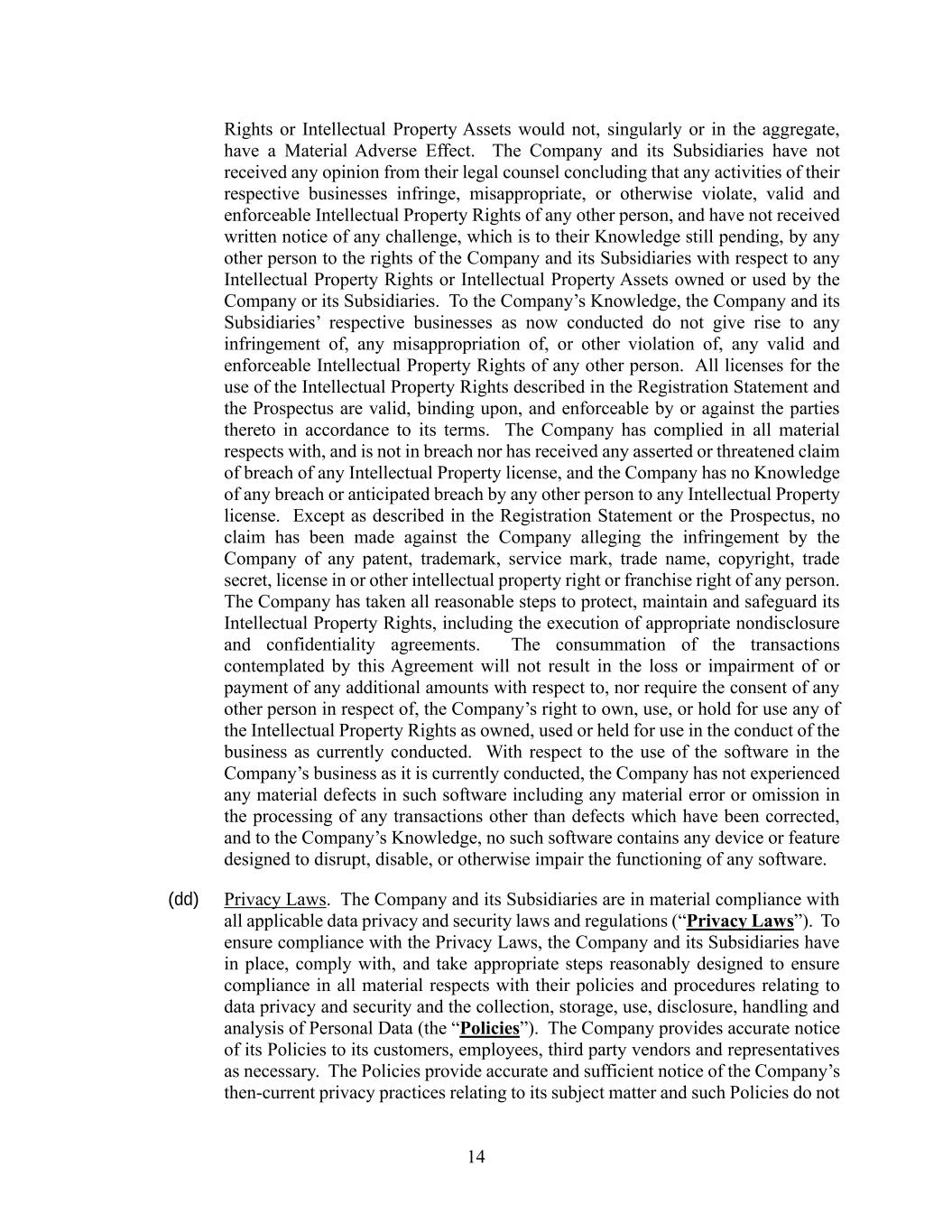 14 Rights or Intellectual Property Assets would not, singularly or in the aggregate, have a Material Adverse Effect. The Company and its Subsidiaries have not received any opinion from their legal counsel concluding that any activities of their respective businesses infringe, misappropriate, or otherwise violate, valid and enforceable Intellectual Property Rights of any other person, and have not received written notice of any challenge, which is to their Knowledge still pending, by any other person to the rights of the Company and its Subsidiaries with respect to any Intellectual Property Rights or Intellectual Property Assets owned or used by the Company or its Subsidiaries. To the Company’s Knowledge, the Company and its Subsidiaries’ respective businesses as now conducted do not give rise to any infringement of, any misappropriation of, or other violation of, any valid and enforceable Intellectual Property Rights of any other person. All licenses for the use of the Intellectual Property Rights described in the Registration Statement and the Prospectus are valid, binding upon, and enforceable by or against the parties thereto in accordance to its terms. The Company has complied in all material respects with, and is not in breach nor has received any asserted or threatened claim of breach of any Intellectual Property license, and the Company has no Knowledge of any breach or anticipated breach by any other person to any Intellectual Property license. Except as described in the Registration Statement or the Prospectus, no claim has been made against the Company alleging the infringement by the Company of any patent, trademark, service mark, trade name, copyright, trade secret, license in or other intellectual property right or franchise right of any person. The Company has taken all reasonable steps to protect, maintain and safeguard its Intellectual Property Rights, including the execution of appropriate nondisclosure and confidentiality agreements. The consummation of the transactions contemplated by this Agreement will not result in the loss or impairment of or payment of any additional amounts with respect to, nor require the consent of any other person in respect of, the Company’s right to own, use, or hold for use any of the Intellectual Property Rights as owned, used or held for use in the conduct of the business as currently conducted. With respect to the use of the software in the Company’s business as it is currently conducted, the Company has not experienced any material defects in such software including any material error or omission in the processing of any transactions other than defects which have been corrected, and to the Company’s Knowledge, no such software contains any device or feature designed to disrupt, disable, or otherwise impair the functioning of any software. (dd) Privacy Laws. The Company and its Subsidiaries are in material compliance with all applicable data privacy and security laws and regulations (“Privacy Laws”). To ensure compliance with the Privacy Laws, the Company and its Subsidiaries have in place, comply with, and take appropriate steps reasonably designed to ensure compliance in all material respects with their policies and procedures relating to data privacy and security and the collection, storage, use, disclosure, handling and analysis of Personal Data (the “Policies”). The Company provides accurate notice of its Policies to its customers, employees, third party vendors and representatives as necessary. The Policies provide accurate and sufficient notice of the Company’s then-current privacy practices relating to its subject matter and such Policies do not