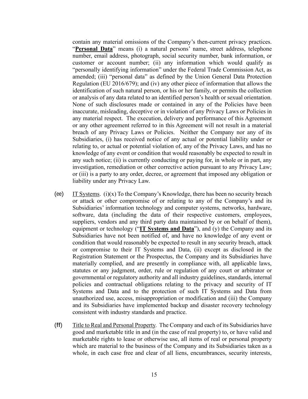 15 contain any material omissions of the Company’s then-current privacy practices. “Personal Data” means (i) a natural persons’ name, street address, telephone number, email address, photograph, social security number, bank information, or customer or account number; (ii) any information which would qualify as “personally identifying information” under the Federal Trade Commission Act, as amended; (iii) “personal data” as defined by the Union General Data Protection Regulation (EU 2016/679); and (iv) any other piece of information that allows the identification of such natural person, or his or her family, or permits the collection or analysis of any data related to an identified person’s health or sexual orientation. None of such disclosures made or contained in any of the Policies have been inaccurate, misleading, deceptive or in violation of any Privacy Laws or Policies in any material respect. The execution, delivery and performance of this Agreement or any other agreement referred to in this Agreement will not result in a material breach of any Privacy Laws or Policies. Neither the Company nor any of its Subsidiaries, (i) has received notice of any actual or potential liability under or relating to, or actual or potential violation of, any of the Privacy Laws, and has no knowledge of any event or condition that would reasonably be expected to result in any such notice; (ii) is currently conducting or paying for, in whole or in part, any investigation, remediation or other corrective action pursuant to any Privacy Law; or (iii) is a party to any order, decree, or agreement that imposed any obligation or liability under any Privacy Law. (ee) IT Systems. (i)(x) To the Company’s Knowledge, there has been no security breach or attack or other compromise of or relating to any of the Company’s and its Subsidiaries’ information technology and computer systems, networks, hardware, software, data (including the data of their respective customers, employees, suppliers, vendors and any third party data maintained by or on behalf of them), equipment or technology (“IT Systems and Data”), and (y) the Company and its Subsidiaries have not been notified of, and have no knowledge of any event or condition that would reasonably be expected to result in any security breach, attack or compromise to their IT Systems and Data, (ii) except as disclosed in the Registration Statement or the Prospectus, the Company and its Subsidiaries have materially complied, and are presently in compliance with, all applicable laws, statutes or any judgment, order, rule or regulation of any court or arbitrator or governmental or regulatory authority and all industry guidelines, standards, internal policies and contractual obligations relating to the privacy and security of IT Systems and Data and to the protection of such IT Systems and Data from unauthorized use, access, misappropriation or modification and (iii) the Company and its Subsidiaries have implemented backup and disaster recovery technology consistent with industry standards and practice. (ff) Title to Real and Personal Property. The Company and each of its Subsidiaries have good and marketable title in and (in the case of real property) to, or have valid and marketable rights to lease or otherwise use, all items of real or personal property which are material to the business of the Company and its Subsidiaries taken as a whole, in each case free and clear of all liens, encumbrances, security interests,