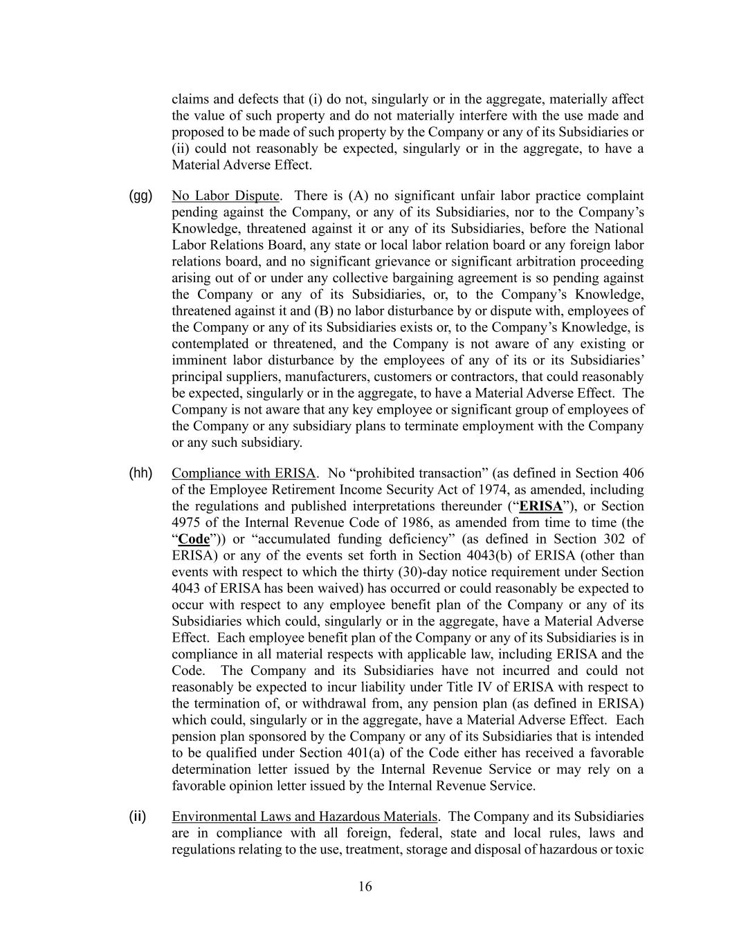 16 claims and defects that (i) do not, singularly or in the aggregate, materially affect the value of such property and do not materially interfere with the use made and proposed to be made of such property by the Company or any of its Subsidiaries or (ii) could not reasonably be expected, singularly or in the aggregate, to have a Material Adverse Effect. (gg) No Labor Dispute. There is (A) no significant unfair labor practice complaint pending against the Company, or any of its Subsidiaries, nor to the Company’s Knowledge, threatened against it or any of its Subsidiaries, before the National Labor Relations Board, any state or local labor relation board or any foreign labor relations board, and no significant grievance or significant arbitration proceeding arising out of or under any collective bargaining agreement is so pending against the Company or any of its Subsidiaries, or, to the Company’s Knowledge, threatened against it and (B) no labor disturbance by or dispute with, employees of the Company or any of its Subsidiaries exists or, to the Company’s Knowledge, is contemplated or threatened, and the Company is not aware of any existing or imminent labor disturbance by the employees of any of its or its Subsidiaries’ principal suppliers, manufacturers, customers or contractors, that could reasonably be expected, singularly or in the aggregate, to have a Material Adverse Effect. The Company is not aware that any key employee or significant group of employees of the Company or any subsidiary plans to terminate employment with the Company or any such subsidiary. (hh) Compliance with ERISA. No “prohibited transaction” (as defined in Section 406 of the Employee Retirement Income Security Act of 1974, as amended, including the regulations and published interpretations thereunder (“ERISA”), or Section 4975 of the Internal Revenue Code of 1986, as amended from time to time (the “Code”)) or “accumulated funding deficiency” (as defined in Section 302 of ERISA) or any of the events set forth in Section 4043(b) of ERISA (other than events with respect to which the thirty (30)-day notice requirement under Section 4043 of ERISA has been waived) has occurred or could reasonably be expected to occur with respect to any employee benefit plan of the Company or any of its Subsidiaries which could, singularly or in the aggregate, have a Material Adverse Effect. Each employee benefit plan of the Company or any of its Subsidiaries is in compliance in all material respects with applicable law, including ERISA and the Code. The Company and its Subsidiaries have not incurred and could not reasonably be expected to incur liability under Title IV of ERISA with respect to the termination of, or withdrawal from, any pension plan (as defined in ERISA) which could, singularly or in the aggregate, have a Material Adverse Effect. Each pension plan sponsored by the Company or any of its Subsidiaries that is intended to be qualified under Section 401(a) of the Code either has received a favorable determination letter issued by the Internal Revenue Service or may rely on a favorable opinion letter issued by the Internal Revenue Service. (ii) Environmental Laws and Hazardous Materials. The Company and its Subsidiaries are in compliance with all foreign, federal, state and local rules, laws and regulations relating to the use, treatment, storage and disposal of hazardous or toxic