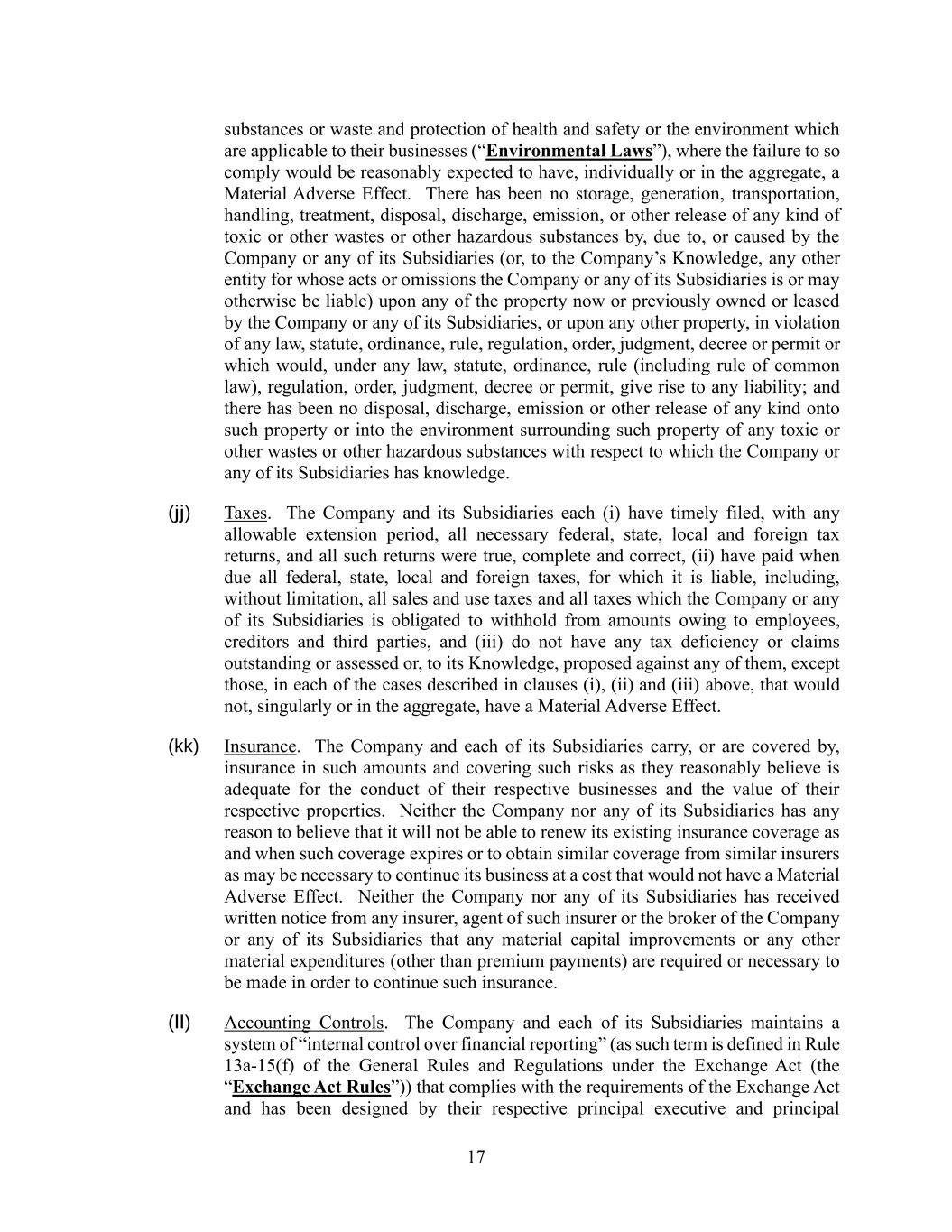 17 substances or waste and protection of health and safety or the environment which are applicable to their businesses (“Environmental Laws”), where the failure to so comply would be reasonably expected to have, individually or in the aggregate, a Material Adverse Effect. There has been no storage, generation, transportation, handling, treatment, disposal, discharge, emission, or other release of any kind of toxic or other wastes or other hazardous substances by, due to, or caused by the Company or any of its Subsidiaries (or, to the Company’s Knowledge, any other entity for whose acts or omissions the Company or any of its Subsidiaries is or may otherwise be liable) upon any of the property now or previously owned or leased by the Company or any of its Subsidiaries, or upon any other property, in violation of any law, statute, ordinance, rule, regulation, order, judgment, decree or permit or which would, under any law, statute, ordinance, rule (including rule of common law), regulation, order, judgment, decree or permit, give rise to any liability; and there has been no disposal, discharge, emission or other release of any kind onto such property or into the environment surrounding such property of any toxic or other wastes or other hazardous substances with respect to which the Company or any of its Subsidiaries has knowledge. (jj) Taxes. The Company and its Subsidiaries each (i) have timely filed, with any allowable extension period, all necessary federal, state, local and foreign tax returns, and all such returns were true, complete and correct, (ii) have paid when due all federal, state, local and foreign taxes, for which it is liable, including, without limitation, all sales and use taxes and all taxes which the Company or any of its Subsidiaries is obligated to withhold from amounts owing to employees, creditors and third parties, and (iii) do not have any tax deficiency or claims outstanding or assessed or, to its Knowledge, proposed against any of them, except those, in each of the cases described in clauses (i), (ii) and (iii) above, that would not, singularly or in the aggregate, have a Material Adverse Effect. (kk) Insurance. The Company and each of its Subsidiaries carry, or are covered by, insurance in such amounts and covering such risks as they reasonably believe is adequate for the conduct of their respective businesses and the value of their respective properties. Neither the Company nor any of its Subsidiaries has any reason to believe that it will not be able to renew its existing insurance coverage as and when such coverage expires or to obtain similar coverage from similar insurers as may be necessary to continue its business at a cost that would not have a Material Adverse Effect. Neither the Company nor any of its Subsidiaries has received written notice from any insurer, agent of such insurer or the broker of the Company or any of its Subsidiaries that any material capital improvements or any other material expenditures (other than premium payments) are required or necessary to be made in order to continue such insurance. (ll) Accounting Controls. The Company and each of its Subsidiaries maintains a system of “internal control over financial reporting” (as such term is defined in Rule 13a-15(f) of the General Rules and Regulations under the Exchange Act (the “Exchange Act Rules”)) that complies with the requirements of the Exchange Act and has been designed by their respective principal executive and principal