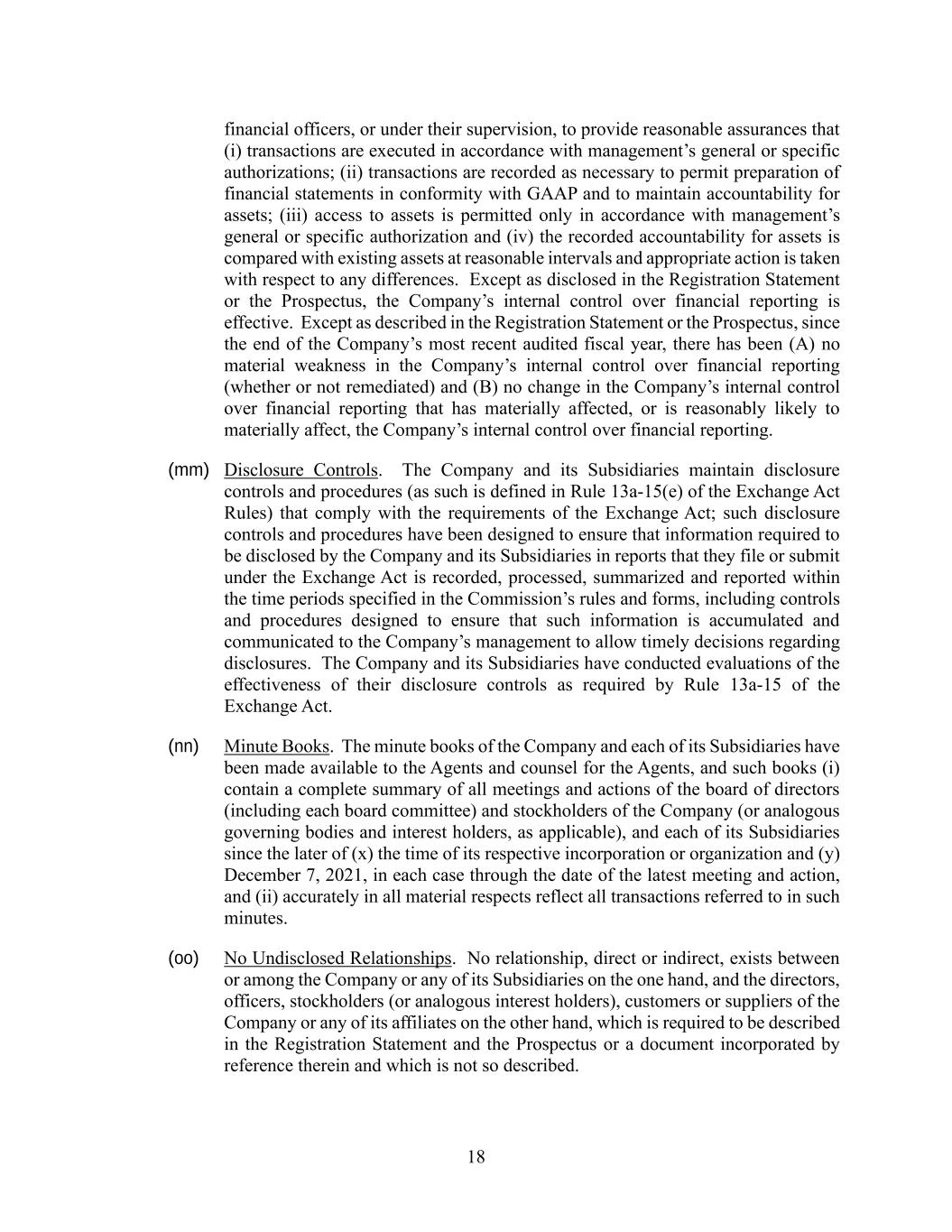 18 financial officers, or under their supervision, to provide reasonable assurances that (i) transactions are executed in accordance with management’s general or specific authorizations; (ii) transactions are recorded as necessary to permit preparation of financial statements in conformity with GAAP and to maintain accountability for assets; (iii) access to assets is permitted only in accordance with management’s general or specific authorization and (iv) the recorded accountability for assets is compared with existing assets at reasonable intervals and appropriate action is taken with respect to any differences. Except as disclosed in the Registration Statement or the Prospectus, the Company’s internal control over financial reporting is effective. Except as described in the Registration Statement or the Prospectus, since the end of the Company’s most recent audited fiscal year, there has been (A) no material weakness in the Company’s internal control over financial reporting (whether or not remediated) and (B) no change in the Company’s internal control over financial reporting that has materially affected, or is reasonably likely to materially affect, the Company’s internal control over financial reporting. (mm) Disclosure Controls. The Company and its Subsidiaries maintain disclosure controls and procedures (as such is defined in Rule 13a-15(e) of the Exchange Act Rules) that comply with the requirements of the Exchange Act; such disclosure controls and procedures have been designed to ensure that information required to be disclosed by the Company and its Subsidiaries in reports that they file or submit under the Exchange Act is recorded, processed, summarized and reported within the time periods specified in the Commission’s rules and forms, including controls and procedures designed to ensure that such information is accumulated and communicated to the Company’s management to allow timely decisions regarding disclosures. The Company and its Subsidiaries have conducted evaluations of the effectiveness of their disclosure controls as required by Rule 13a-15 of the Exchange Act. (nn) Minute Books. The minute books of the Company and each of its Subsidiaries have been made available to the Agents and counsel for the Agents, and such books (i) contain a complete summary of all meetings and actions of the board of directors (including each board committee) and stockholders of the Company (or analogous governing bodies and interest holders, as applicable), and each of its Subsidiaries since the later of (x) the time of its respective incorporation or organization and (y) December 7, 2021, in each case through the date of the latest meeting and action, and (ii) accurately in all material respects reflect all transactions referred to in such minutes. (oo) No Undisclosed Relationships. No relationship, direct or indirect, exists between or among the Company or any of its Subsidiaries on the one hand, and the directors, officers, stockholders (or analogous interest holders), customers or suppliers of the Company or any of its affiliates on the other hand, which is required to be described in the Registration Statement and the Prospectus or a document incorporated by reference therein and which is not so described.