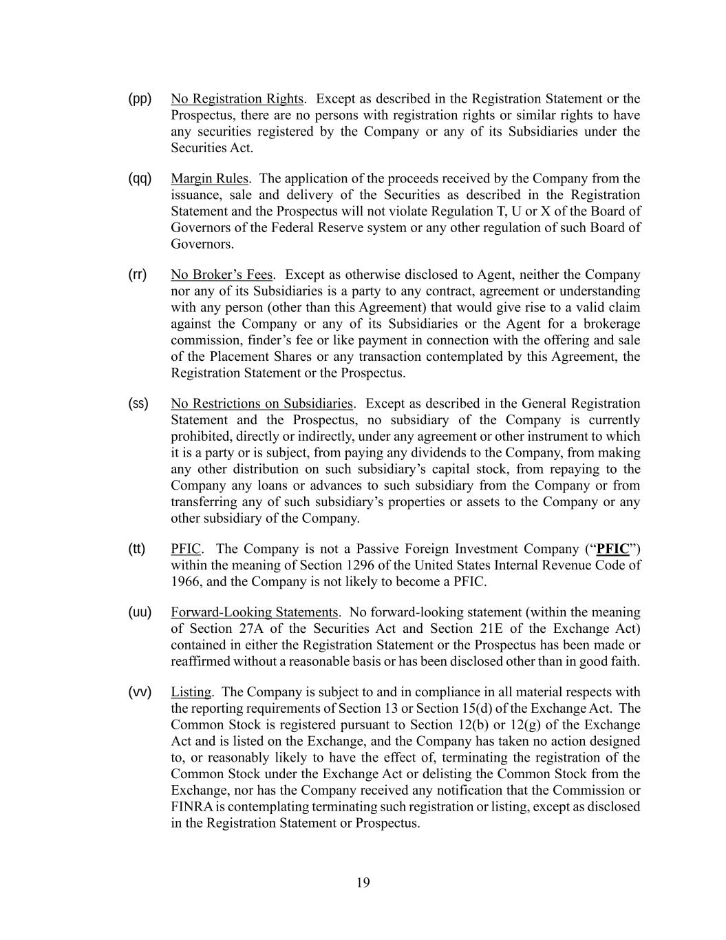 19 (pp) No Registration Rights. Except as described in the Registration Statement or the Prospectus, there are no persons with registration rights or similar rights to have any securities registered by the Company or any of its Subsidiaries under the Securities Act. (qq) Margin Rules. The application of the proceeds received by the Company from the issuance, sale and delivery of the Securities as described in the Registration Statement and the Prospectus will not violate Regulation T, U or X of the Board of Governors of the Federal Reserve system or any other regulation of such Board of Governors. (rr) No Broker’s Fees. Except as otherwise disclosed to Agent, neither the Company nor any of its Subsidiaries is a party to any contract, agreement or understanding with any person (other than this Agreement) that would give rise to a valid claim against the Company or any of its Subsidiaries or the Agent for a brokerage commission, finder’s fee or like payment in connection with the offering and sale of the Placement Shares or any transaction contemplated by this Agreement, the Registration Statement or the Prospectus. (ss) No Restrictions on Subsidiaries. Except as described in the General Registration Statement and the Prospectus, no subsidiary of the Company is currently prohibited, directly or indirectly, under any agreement or other instrument to which it is a party or is subject, from paying any dividends to the Company, from making any other distribution on such subsidiary’s capital stock, from repaying to the Company any loans or advances to such subsidiary from the Company or from transferring any of such subsidiary’s properties or assets to the Company or any other subsidiary of the Company. (tt) PFIC. The Company is not a Passive Foreign Investment Company (“PFIC”) within the meaning of Section 1296 of the United States Internal Revenue Code of 1966, and the Company is not likely to become a PFIC. (uu) Forward-Looking Statements. No forward-looking statement (within the meaning of Section 27A of the Securities Act and Section 21E of the Exchange Act) contained in either the Registration Statement or the Prospectus has been made or reaffirmed without a reasonable basis or has been disclosed other than in good faith. (vv) Listing. The Company is subject to and in compliance in all material respects with the reporting requirements of Section 13 or Section 15(d) of the Exchange Act. The Common Stock is registered pursuant to Section 12(b) or 12(g) of the Exchange Act and is listed on the Exchange, and the Company has taken no action designed to, or reasonably likely to have the effect of, terminating the registration of the Common Stock under the Exchange Act or delisting the Common Stock from the Exchange, nor has the Company received any notification that the Commission or FINRA is contemplating terminating such registration or listing, except as disclosed in the Registration Statement or Prospectus.