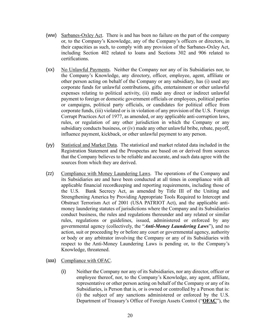 20 (ww) Sarbanes-Oxley Act. There is and has been no failure on the part of the company or, to the Company’s Knowledge, any of the Company’s officers or directors, in their capacities as such, to comply with any provision of the Sarbanes-Oxley Act, including Section 402 related to loans and Sections 302 and 906 related to certifications. (xx) No Unlawful Payments. Neither the Company nor any of its Subsidiaries nor, to the Company’s Knowledge, any directory, officer, employee, agent, affiliate or other person acting on behalf of the Company or any subsidiary, has (i) used any corporate funds for unlawful contributions, gifts, entertainment or other unlawful expenses relating to political activity, (ii) made any direct or indirect unlawful payment to foreign or domestic government officials or employees, political parties or campaigns, political party officials, or candidates for political office from corporate funds, (iii) violated or is in violation of any provision of the U.S. Foreign Corrupt Practices Act of 1977, as amended, or any applicable anti-corruption laws, rules, or regulation of any other jurisdiction in which the Company or any subsidiary conducts business, or (iv) made any other unlawful bribe, rebate, payoff, influence payment, kickback, or other unlawful payment to any person. (yy) Statistical and Market Data. The statistical and market related data included in the Registration Statement and the Prospectus are based on or derived from sources that the Company believes to be reliable and accurate, and such data agree with the sources from which they are derived. (zz) Compliance with Money Laundering Laws. The operations of the Company and its Subsidiaries are and have been conducted at all times in compliance with all applicable financial recordkeeping and reporting requirements, including those of the U.S. Bank Secrecy Act, as amended by Title III of the Uniting and Strengthening America by Providing Appropriate Tools Required to Intercept and Obstruct Terrorism Act of 2001 (USA PATRIOT Act), and the applicable anti- money laundering statutes of jurisdictions where the Company and its Subsidiaries conduct business, the rules and regulations thereunder and any related or similar rules, regulations or guidelines, issued, administered or enforced by any governmental agency (collectively, the “Anti-Money Laundering Laws”), and no action, suit or proceeding by or before any court or governmental agency, authority or body or any arbitrator involving the Company or any of its Subsidiaries with respect to the Anti-Money Laundering Laws is pending or, to the Company’s Knowledge, threatened. (aaa) Compliance with OFAC. (i) Neither the Company nor any of its Subsidiaries, nor any director, officer or employee thereof, nor, to the Company’s Knowledge, any agent, affiliate, representative or other person acting on behalf of the Company or any of its Subsidiaries, is Person that is, or is owned or controlled by a Person that is: (i) the subject of any sanctions administered or enforced by the U.S. Department of Treasury’s Office of Foreign Assets Control (“OFAC”), the