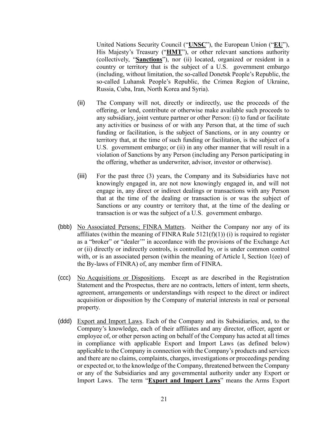 21 United Nations Security Council (“UNSC”), the European Union (“EU”), His Majesty’s Treasury (“HMT”), or other relevant sanctions authority (collectively, “Sanctions”), nor (ii) located, organized or resident in a country or territory that is the subject of a U.S. government embargo (including, without limitation, the so-called Donetsk People’s Republic, the so-called Luhansk People’s Republic, the Crimea Region of Ukraine, Russia, Cuba, Iran, North Korea and Syria). (ii) The Company will not, directly or indirectly, use the proceeds of the offering, or lend, contribute or otherwise make available such proceeds to any subsidiary, joint venture partner or other Person: (i) to fund or facilitate any activities or business of or with any Person that, at the time of such funding or facilitation, is the subject of Sanctions, or in any country or territory that, at the time of such funding or facilitation, is the subject of a U.S. government embargo; or (ii) in any other manner that will result in a violation of Sanctions by any Person (including any Person participating in the offering, whether as underwriter, advisor, investor or otherwise). (iii) For the past three (3) years, the Company and its Subsidiaries have not knowingly engaged in, are not now knowingly engaged in, and will not engage in, any direct or indirect dealings or transactions with any Person that at the time of the dealing or transaction is or was the subject of Sanctions or any country or territory that, at the time of the dealing or transaction is or was the subject of a U.S. government embargo. (bbb) No Associated Persons; FINRA Matters. Neither the Company nor any of its affiliates (within the meaning of FINRA Rule 5121(f)(1)) (i) is required to register as a “broker” or “dealer’” in accordance with the provisions of the Exchange Act or (ii) directly or indirectly controls, is controlled by, or is under common control with, or is an associated person (within the meaning of Article I, Section 1(ee) of the By-laws of FINRA) of, any member firm of FINRA. (ccc) No Acquisitions or Dispositions. Except as are described in the Registration Statement and the Prospectus, there are no contracts, letters of intent, term sheets, agreement, arrangements or understandings with respect to the direct or indirect acquisition or disposition by the Company of material interests in real or personal property. (ddd) Export and Import Laws. Each of the Company and its Subsidiaries, and, to the Company’s knowledge, each of their affiliates and any director, officer, agent or employee of, or other person acting on behalf of the Company has acted at all times in compliance with applicable Export and Import Laws (as defined below) applicable to the Company in connection with the Company’s products and services and there are no claims, complaints, charges, investigations or proceedings pending or expected or, to the knowledge of the Company, threatened between the Company or any of the Subsidiaries and any governmental authority under any Export or Import Laws. The term “Export and Import Laws” means the Arms Export