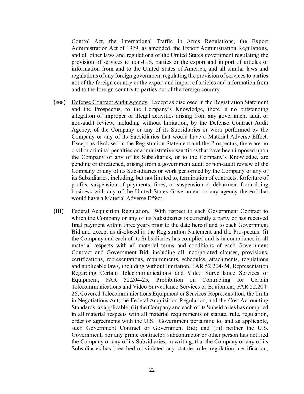 22 Control Act, the International Traffic in Arms Regulations, the Export Administration Act of 1979, as amended, the Export Administration Regulations, and all other laws and regulations of the United States government regulating the provision of services to non-U.S. parties or the export and import of articles or information from and to the United States of America, and all similar laws and regulations of any foreign government regulating the provision of services to parties not of the foreign country or the export and import of articles and information from and to the foreign country to parties not of the foreign country. (eee) Defense Contract Audit Agency. Except as disclosed in the Registration Statement and the Prospectus, to the Company’s Knowledge, there is no outstanding allegation of improper or illegal activities arising from any government audit or non-audit review, including without limitation, by the Defense Contract Audit Agency, of the Company or any of its Subsidiaries or work performed by the Company or any of its Subsidiaries that would have a Material Adverse Effect. Except as disclosed in the Registration Statement and the Prospectus, there are no civil or criminal penalties or administrative sanctions that have been imposed upon the Company or any of its Subsidiaries, or to the Company’s Knowledge, are pending or threatened, arising from a government audit or non-audit review of the Company or any of its Subsidiaries or work performed by the Company or any of its Subsidiaries, including, but not limited to, termination of contracts, forfeiture of profits, suspension of payments, fines, or suspension or debarment from doing business with any of the United States Government or any agency thereof that would have a Material Adverse Effect. (fff) Federal Acquisition Regulation. With respect to each Government Contract to which the Company or any of its Subsidiaries is currently a party or has received final payment within three years prior to the date hereof and to each Government Bid and except as disclosed in the Registration Statement and the Prospectus: (i) the Company and each of its Subsidiaries has complied and is in compliance in all material respects with all material terms and conditions of each Government Contract and Government Bid, including all incorporated clauses, provisions, certifications, representations, requirements, schedules, attachments, regulations and applicable laws, including without limitation, FAR 52.204-24, Representation Regarding Certain Telecommunications and Video Surveillance Services or Equipment, FAR 52.204-25, Prohibition on Contracting for Certain Telecommunications and Video Surveillance Services or Equipment, FAR 52.204- 26, Covered Telecommunications Equipment or Services-Representation, the Truth in Negotiations Act, the Federal Acquisition Regulation, and the Cost Accounting Standards, as applicable; (ii) the Company and each of its Subsidiaries has complied in all material respects with all material requirements of statute, rule, regulation, order or agreements with the U.S. Government pertaining to, and as applicable, such Government Contract or Government Bid; and (iii) neither the U.S. Government, nor any prime contractor, subcontractor or other person has notified the Company or any of its Subsidiaries, in writing, that the Company or any of its Subsidiaries has breached or violated any statute, rule, regulation, certification,