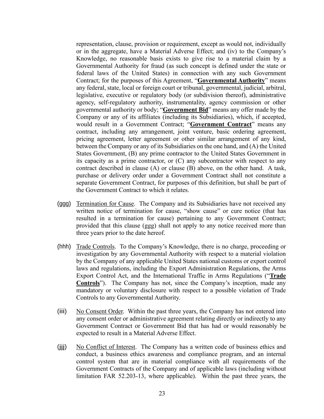 23 representation, clause, provision or requirement, except as would not, individually or in the aggregate, have a Material Adverse Effect; and (iv) to the Company’s Knowledge, no reasonable basis exists to give rise to a material claim by a Governmental Authority for fraud (as such concept is defined under the state or federal laws of the United States) in connection with any such Government Contract; for the purposes of this Agreement, “Governmental Authority” means any federal, state, local or foreign court or tribunal, governmental, judicial, arbitral, legislative, executive or regulatory body (or subdivision thereof), administrative agency, self-regulatory authority, instrumentality, agency commission or other governmental authority or body; “Government Bid” means any offer made by the Company or any of its affiliates (including its Subsidiaries), which, if accepted, would result in a Government Contract; “Government Contract” means any contract, including any arrangement, joint venture, basic ordering agreement, pricing agreement, letter agreement or other similar arrangement of any kind, between the Company or any of its Subsidiaries on the one hand, and (A) the United States Government, (B) any prime contractor to the United States Government in its capacity as a prime contractor, or (C) any subcontractor with respect to any contract described in clause (A) or clause (B) above, on the other hand. A task, purchase or delivery order under a Government Contract shall not constitute a separate Government Contract, for purposes of this definition, but shall be part of the Government Contract to which it relates. (ggg) Termination for Cause. The Company and its Subsidiaries have not received any written notice of termination for cause, “show cause” or cure notice (that has resulted in a termination for cause) pertaining to any Government Contract; provided that this clause (ggg) shall not apply to any notice received more than three years prior to the date hereof. (hhh) Trade Controls. To the Company’s Knowledge, there is no charge, proceeding or investigation by any Governmental Authority with respect to a material violation by the Company of any applicable United States national customs or export control laws and regulations, including the Export Administration Regulations, the Arms Export Control Act, and the International Traffic in Arms Regulations (“Trade Controls”). The Company has not, since the Company’s inception, made any mandatory or voluntary disclosure with respect to a possible violation of Trade Controls to any Governmental Authority. (iii) No Consent Order. Within the past three years, the Company has not entered into any consent order or administrative agreement relating directly or indirectly to any Government Contract or Government Bid that has had or would reasonably be expected to result in a Material Adverse Effect. (jjj) No Conflict of Interest. The Company has a written code of business ethics and conduct, a business ethics awareness and compliance program, and an internal control system that are in material compliance with all requirements of the Government Contracts of the Company and of applicable laws (including without limitation FAR 52.203-13, where applicable). Within the past three years, the