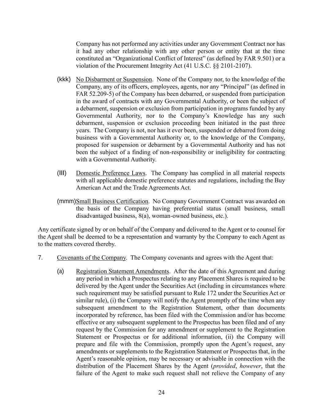 24 Company has not performed any activities under any Government Contract nor has it had any other relationship with any other person or entity that at the time constituted an “Organizational Conflict of Interest” (as defined by FAR 9.501) or a violation of the Procurement Integrity Act (41 U.S.C. §§ 2101-2107). (kkk) No Disbarment or Suspension. None of the Company nor, to the knowledge of the Company, any of its officers, employees, agents, nor any “Principal” (as defined in FAR 52.209-5) of the Company has been debarred, or suspended from participation in the award of contracts with any Governmental Authority, or been the subject of a debarment, suspension or exclusion from participation in programs funded by any Governmental Authority, nor to the Company’s Knowledge has any such debarment, suspension or exclusion proceeding been initiated in the past three years. The Company is not, nor has it ever been, suspended or debarred from doing business with a Governmental Authority or, to the knowledge of the Company, proposed for suspension or debarment by a Governmental Authority and has not been the subject of a finding of non-responsibility or ineligibility for contracting with a Governmental Authority. (lll) Domestic Preference Laws. The Company has complied in all material respects with all applicable domestic preference statutes and regulations, including the Buy American Act and the Trade Agreements Act. (mmm)Small Business Certification. No Company Government Contract was awarded on the basis of the Company having preferential status (small business, small disadvantaged business, 8(a), woman-owned business, etc.). Any certificate signed by or on behalf of the Company and delivered to the Agent or to counsel for the Agent shall be deemed to be a representation and warranty by the Company to each Agent as to the matters covered thereby. 7. Covenants of the Company. The Company covenants and agrees with the Agent that: (a) Registration Statement Amendments. After the date of this Agreement and during any period in which a Prospectus relating to any Placement Shares is required to be delivered by the Agent under the Securities Act (including in circumstances where such requirement may be satisfied pursuant to Rule 172 under the Securities Act or similar rule), (i) the Company will notify the Agent promptly of the time when any subsequent amendment to the Registration Statement, other than documents incorporated by reference, has been filed with the Commission and/or has become effective or any subsequent supplement to the Prospectus has been filed and of any request by the Commission for any amendment or supplement to the Registration Statement or Prospectus or for additional information, (ii) the Company will prepare and file with the Commission, promptly upon the Agent’s request, any amendments or supplements to the Registration Statement or Prospectus that, in the Agent’s reasonable opinion, may be necessary or advisable in connection with the distribution of the Placement Shares by the Agent (provided, however, that the failure of the Agent to make such request shall not relieve the Company of any