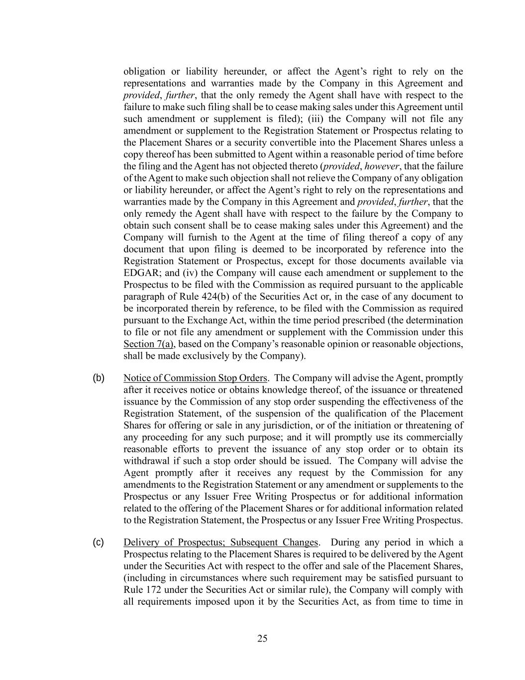25 obligation or liability hereunder, or affect the Agent’s right to rely on the representations and warranties made by the Company in this Agreement and provided, further, that the only remedy the Agent shall have with respect to the failure to make such filing shall be to cease making sales under this Agreement until such amendment or supplement is filed); (iii) the Company will not file any amendment or supplement to the Registration Statement or Prospectus relating to the Placement Shares or a security convertible into the Placement Shares unless a copy thereof has been submitted to Agent within a reasonable period of time before the filing and the Agent has not objected thereto (provided, however, that the failure of the Agent to make such objection shall not relieve the Company of any obligation or liability hereunder, or affect the Agent’s right to rely on the representations and warranties made by the Company in this Agreement and provided, further, that the only remedy the Agent shall have with respect to the failure by the Company to obtain such consent shall be to cease making sales under this Agreement) and the Company will furnish to the Agent at the time of filing thereof a copy of any document that upon filing is deemed to be incorporated by reference into the Registration Statement or Prospectus, except for those documents available via EDGAR; and (iv) the Company will cause each amendment or supplement to the Prospectus to be filed with the Commission as required pursuant to the applicable paragraph of Rule 424(b) of the Securities Act or, in the case of any document to be incorporated therein by reference, to be filed with the Commission as required pursuant to the Exchange Act, within the time period prescribed (the determination to file or not file any amendment or supplement with the Commission under this Section 7(a), based on the Company’s reasonable opinion or reasonable objections, shall be made exclusively by the Company). (b) Notice of Commission Stop Orders. The Company will advise the Agent, promptly after it receives notice or obtains knowledge thereof, of the issuance or threatened issuance by the Commission of any stop order suspending the effectiveness of the Registration Statement, of the suspension of the qualification of the Placement Shares for offering or sale in any jurisdiction, or of the initiation or threatening of any proceeding for any such purpose; and it will promptly use its commercially reasonable efforts to prevent the issuance of any stop order or to obtain its withdrawal if such a stop order should be issued. The Company will advise the Agent promptly after it receives any request by the Commission for any amendments to the Registration Statement or any amendment or supplements to the Prospectus or any Issuer Free Writing Prospectus or for additional information related to the offering of the Placement Shares or for additional information related to the Registration Statement, the Prospectus or any Issuer Free Writing Prospectus. (c) Delivery of Prospectus; Subsequent Changes. During any period in which a Prospectus relating to the Placement Shares is required to be delivered by the Agent under the Securities Act with respect to the offer and sale of the Placement Shares, (including in circumstances where such requirement may be satisfied pursuant to Rule 172 under the Securities Act or similar rule), the Company will comply with all requirements imposed upon it by the Securities Act, as from time to time in