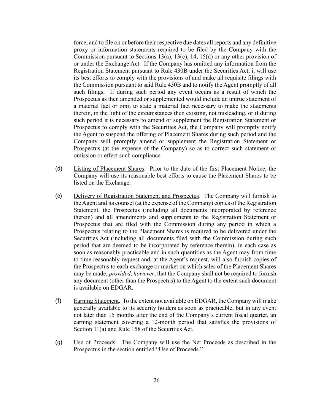 26 force, and to file on or before their respective due dates all reports and any definitive proxy or information statements required to be filed by the Company with the Commission pursuant to Sections 13(a), 13(c), 14, 15(d) or any other provision of or under the Exchange Act. If the Company has omitted any information from the Registration Statement pursuant to Rule 430B under the Securities Act, it will use its best efforts to comply with the provisions of and make all requisite filings with the Commission pursuant to said Rule 430B and to notify the Agent promptly of all such filings. If during such period any event occurs as a result of which the Prospectus as then amended or supplemented would include an untrue statement of a material fact or omit to state a material fact necessary to make the statements therein, in the light of the circumstances then existing, not misleading, or if during such period it is necessary to amend or supplement the Registration Statement or Prospectus to comply with the Securities Act, the Company will promptly notify the Agent to suspend the offering of Placement Shares during such period and the Company will promptly amend or supplement the Registration Statement or Prospectus (at the expense of the Company) so as to correct such statement or omission or effect such compliance. (d) Listing of Placement Shares. Prior to the date of the first Placement Notice, the Company will use its reasonable best efforts to cause the Placement Shares to be listed on the Exchange. (e) Delivery of Registration Statement and Prospectus. The Company will furnish to the Agent and its counsel (at the expense of the Company) copies of the Registration Statement, the Prospectus (including all documents incorporated by reference therein) and all amendments and supplements to the Registration Statement or Prospectus that are filed with the Commission during any period in which a Prospectus relating to the Placement Shares is required to be delivered under the Securities Act (including all documents filed with the Commission during such period that are deemed to be incorporated by reference therein), in each case as soon as reasonably practicable and in such quantities as the Agent may from time to time reasonably request and, at the Agent’s request, will also furnish copies of the Prospectus to each exchange or market on which sales of the Placement Shares may be made; provided, however, that the Company shall not be required to furnish any document (other than the Prospectus) to the Agent to the extent such document is available on EDGAR. (f) Earning Statement. To the extent not available on EDGAR, the Company will make generally available to its security holders as soon as practicable, but in any event not later than 15 months after the end of the Company’s current fiscal quarter, an earning statement covering a 12-month period that satisfies the provisions of Section 11(a) and Rule 158 of the Securities Act. (g) Use of Proceeds. The Company will use the Net Proceeds as described in the Prospectus in the section entitled “Use of Proceeds.”