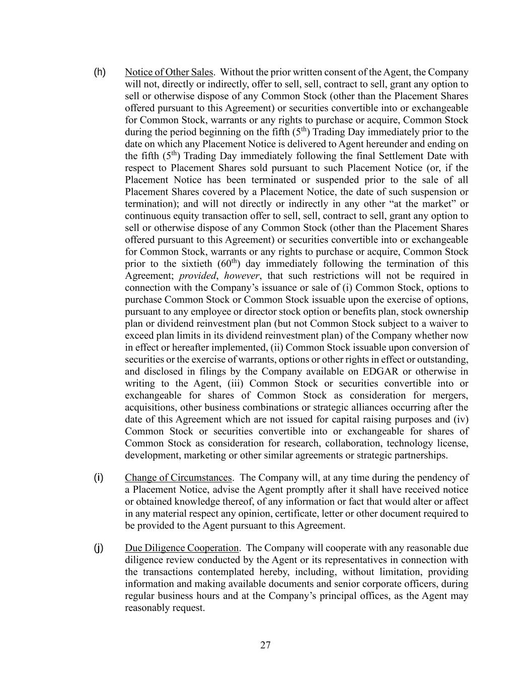 27 (h) Notice of Other Sales. Without the prior written consent of the Agent, the Company will not, directly or indirectly, offer to sell, sell, contract to sell, grant any option to sell or otherwise dispose of any Common Stock (other than the Placement Shares offered pursuant to this Agreement) or securities convertible into or exchangeable for Common Stock, warrants or any rights to purchase or acquire, Common Stock during the period beginning on the fifth (5th) Trading Day immediately prior to the date on which any Placement Notice is delivered to Agent hereunder and ending on the fifth (5th) Trading Day immediately following the final Settlement Date with respect to Placement Shares sold pursuant to such Placement Notice (or, if the Placement Notice has been terminated or suspended prior to the sale of all Placement Shares covered by a Placement Notice, the date of such suspension or termination); and will not directly or indirectly in any other “at the market” or continuous equity transaction offer to sell, sell, contract to sell, grant any option to sell or otherwise dispose of any Common Stock (other than the Placement Shares offered pursuant to this Agreement) or securities convertible into or exchangeable for Common Stock, warrants or any rights to purchase or acquire, Common Stock prior to the sixtieth (60th) day immediately following the termination of this Agreement; provided, however, that such restrictions will not be required in connection with the Company’s issuance or sale of (i) Common Stock, options to purchase Common Stock or Common Stock issuable upon the exercise of options, pursuant to any employee or director stock option or benefits plan, stock ownership plan or dividend reinvestment plan (but not Common Stock subject to a waiver to exceed plan limits in its dividend reinvestment plan) of the Company whether now in effect or hereafter implemented, (ii) Common Stock issuable upon conversion of securities or the exercise of warrants, options or other rights in effect or outstanding, and disclosed in filings by the Company available on EDGAR or otherwise in writing to the Agent, (iii) Common Stock or securities convertible into or exchangeable for shares of Common Stock as consideration for mergers, acquisitions, other business combinations or strategic alliances occurring after the date of this Agreement which are not issued for capital raising purposes and (iv) Common Stock or securities convertible into or exchangeable for shares of Common Stock as consideration for research, collaboration, technology license, development, marketing or other similar agreements or strategic partnerships. (i) Change of Circumstances. The Company will, at any time during the pendency of a Placement Notice, advise the Agent promptly after it shall have received notice or obtained knowledge thereof, of any information or fact that would alter or affect in any material respect any opinion, certificate, letter or other document required to be provided to the Agent pursuant to this Agreement. (j) Due Diligence Cooperation. The Company will cooperate with any reasonable due diligence review conducted by the Agent or its representatives in connection with the transactions contemplated hereby, including, without limitation, providing information and making available documents and senior corporate officers, during regular business hours and at the Company’s principal offices, as the Agent may reasonably request.